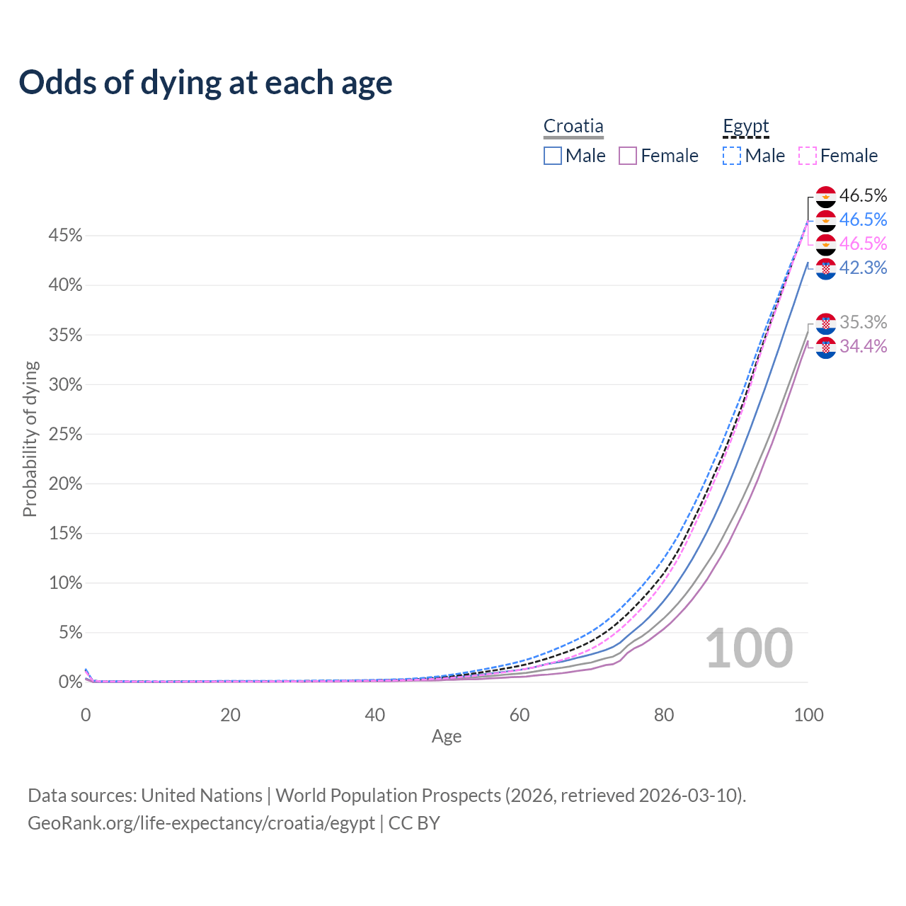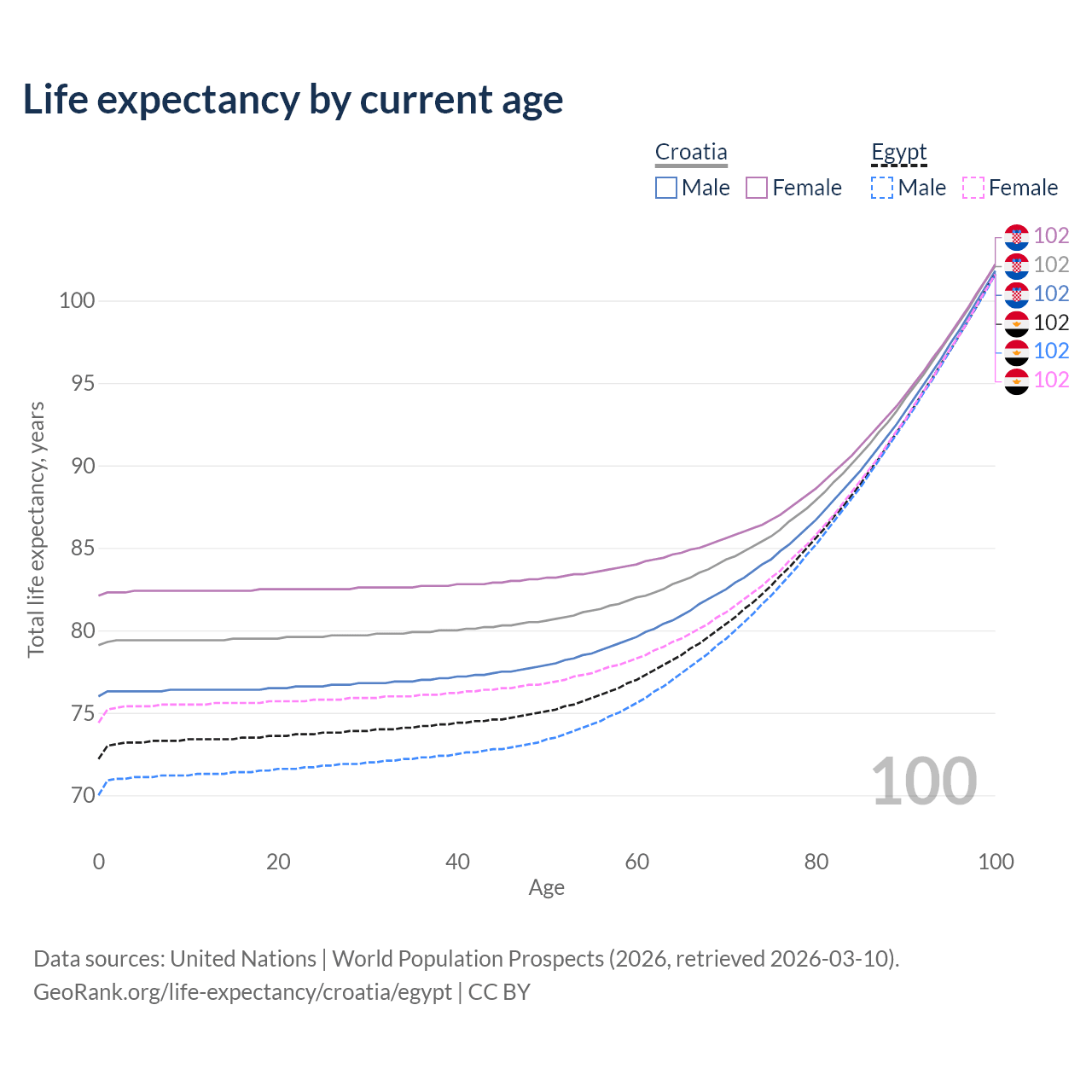 This life expectancy calculator shows the odds of living to 100, 95, 90, and below based on current age for both males and females in Croatia and Egypt, along with mean and median age of death. The calculations are based on the 2026 life tables (actuarial tables) from the UN World Population Prospects.