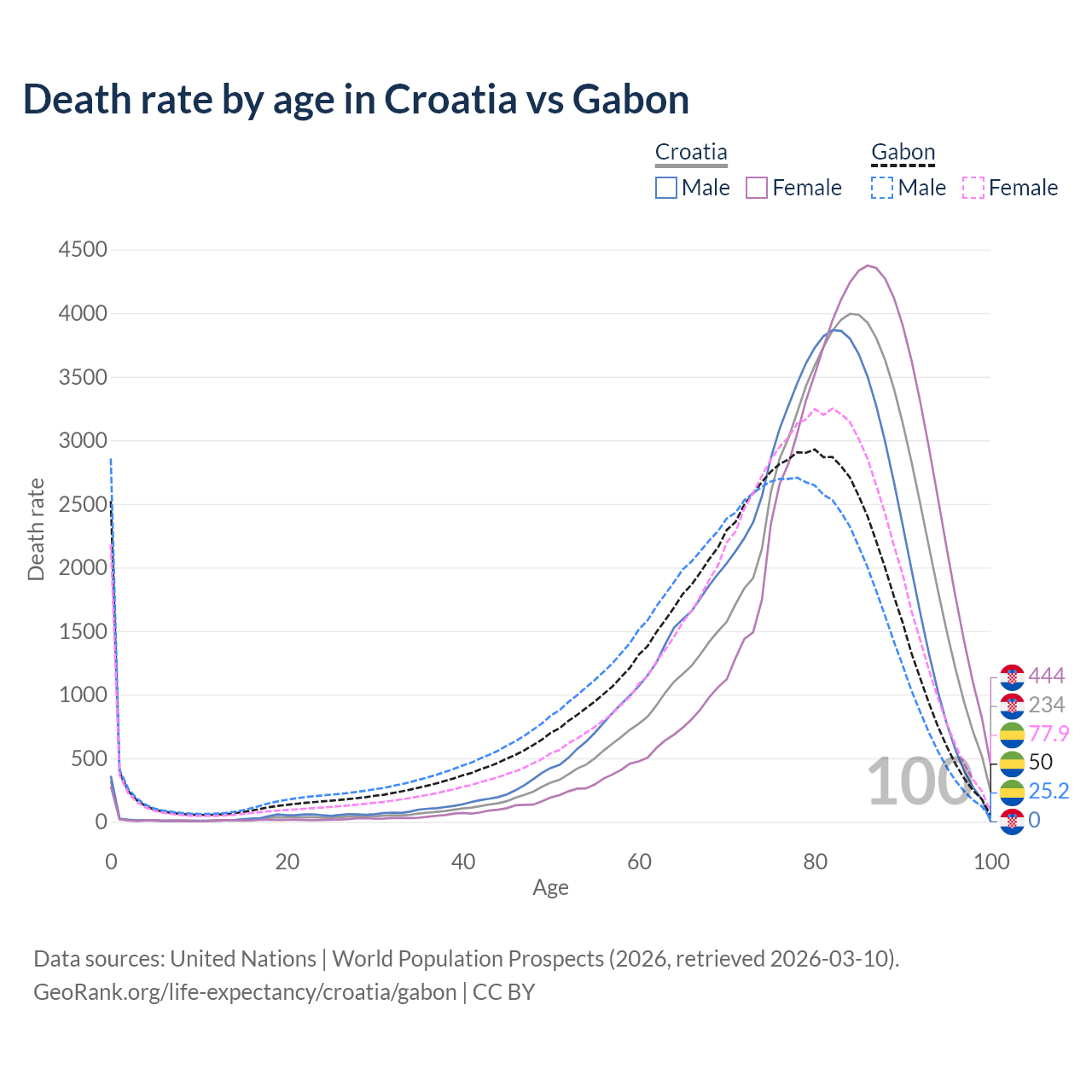 In Croatia, the most common age of death is 84, compared to 80 in Gabon. The median age of death is 81.7 in Croatia and 73.9 in Gabon, meaning only half of each cohort is expected to live past that age.