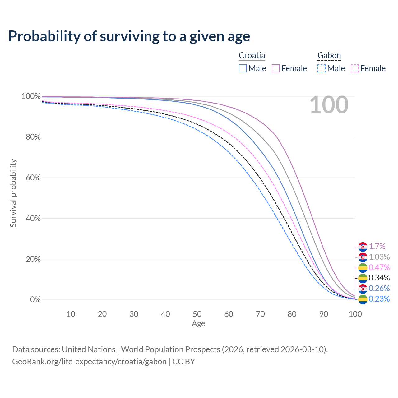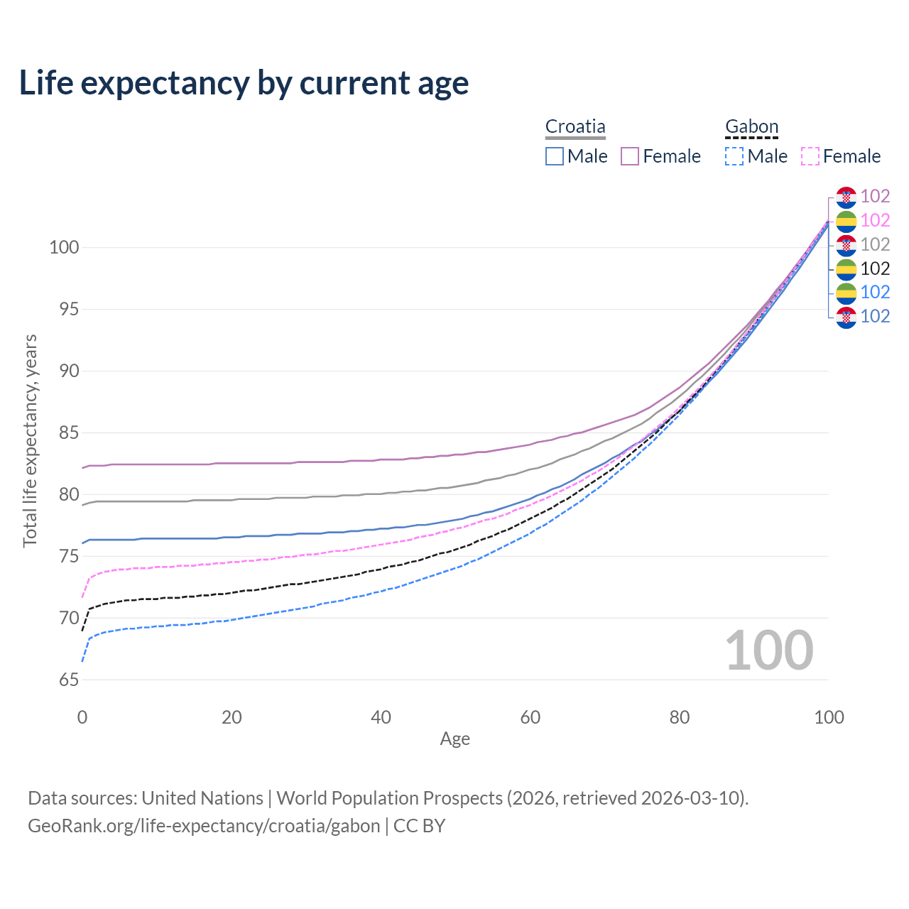 This life expectancy calculator shows the odds of living to 100, 95, 90, and below based on current age for both males and females in Croatia and Gabon, along with mean and median age of death. The calculations are based on the 2026 life tables (actuarial tables) from the UN World Population Prospects.