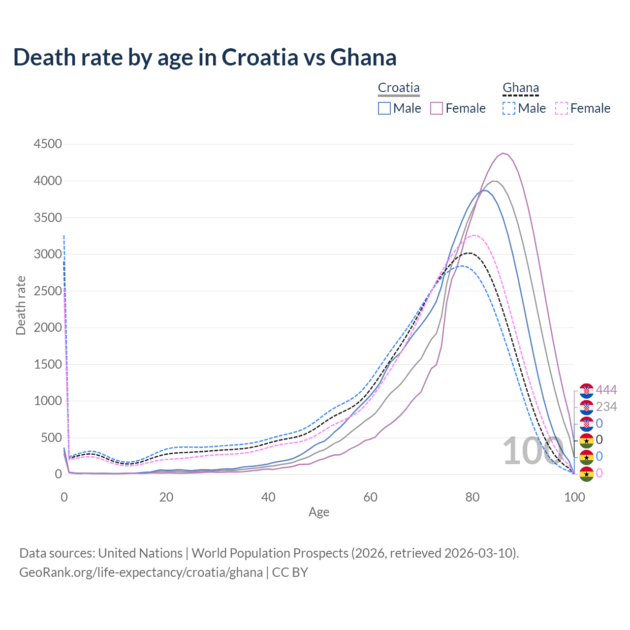 This life expectancy calculator shows the odds of living to 100, 95, 90, and below based on current age for both males and females in Croatia and Ghana, along with mean and median age of death. The calculations are based on the 2026 life tables (actuarial tables) from the UN World Population Prospects.