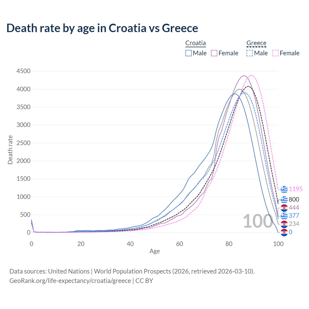 In Croatia, the most common age of death is 84, compared to 88 in Greece. The median age of death is 81.7 in Croatia and 84.9 in Greece, meaning only half of each cohort is expected to live past that age.