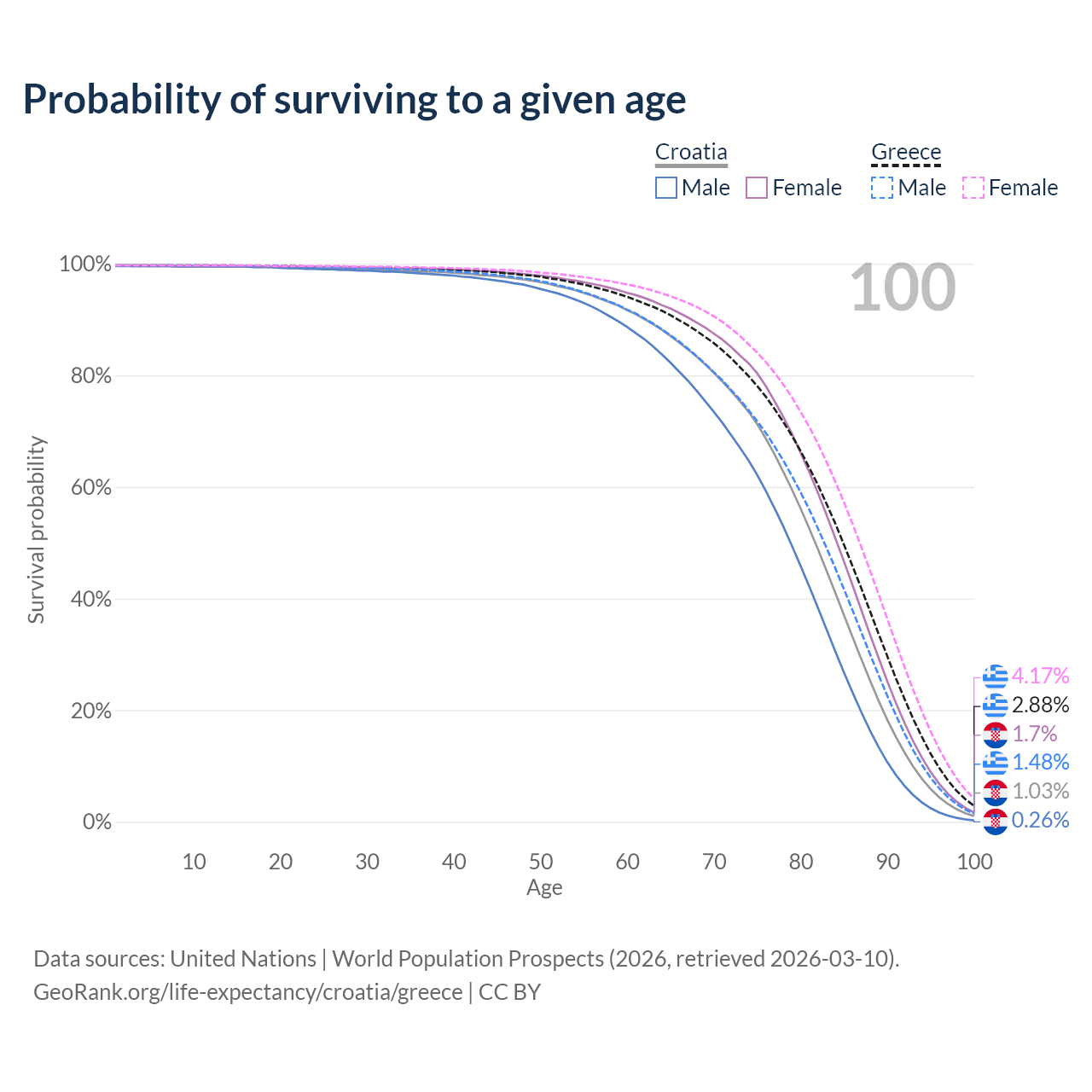 This life expectancy calculator shows the odds of living to 100, 95, 90, and below based on current age for both males and females in Croatia and Greece, along with mean and median age of death. The calculations are based on the 2026 life tables (actuarial tables) from the UN World Population Prospects.