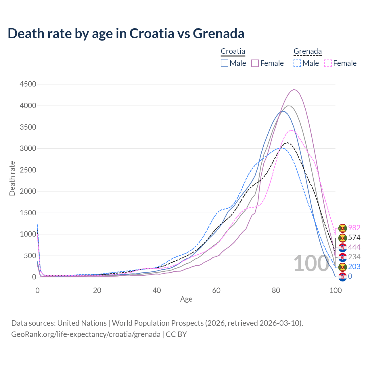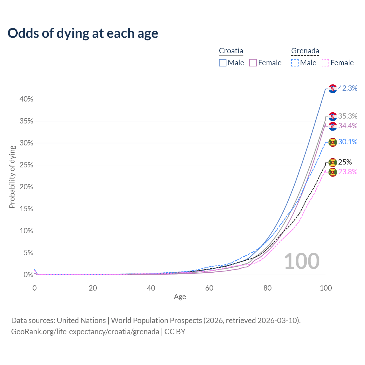 This life expectancy calculator shows the odds of living to 100, 95, 90, and below based on current age for both males and females in Croatia and Grenada, along with mean and median age of death. The calculations are based on the 2026 life tables (actuarial tables) from the UN World Population Prospects.