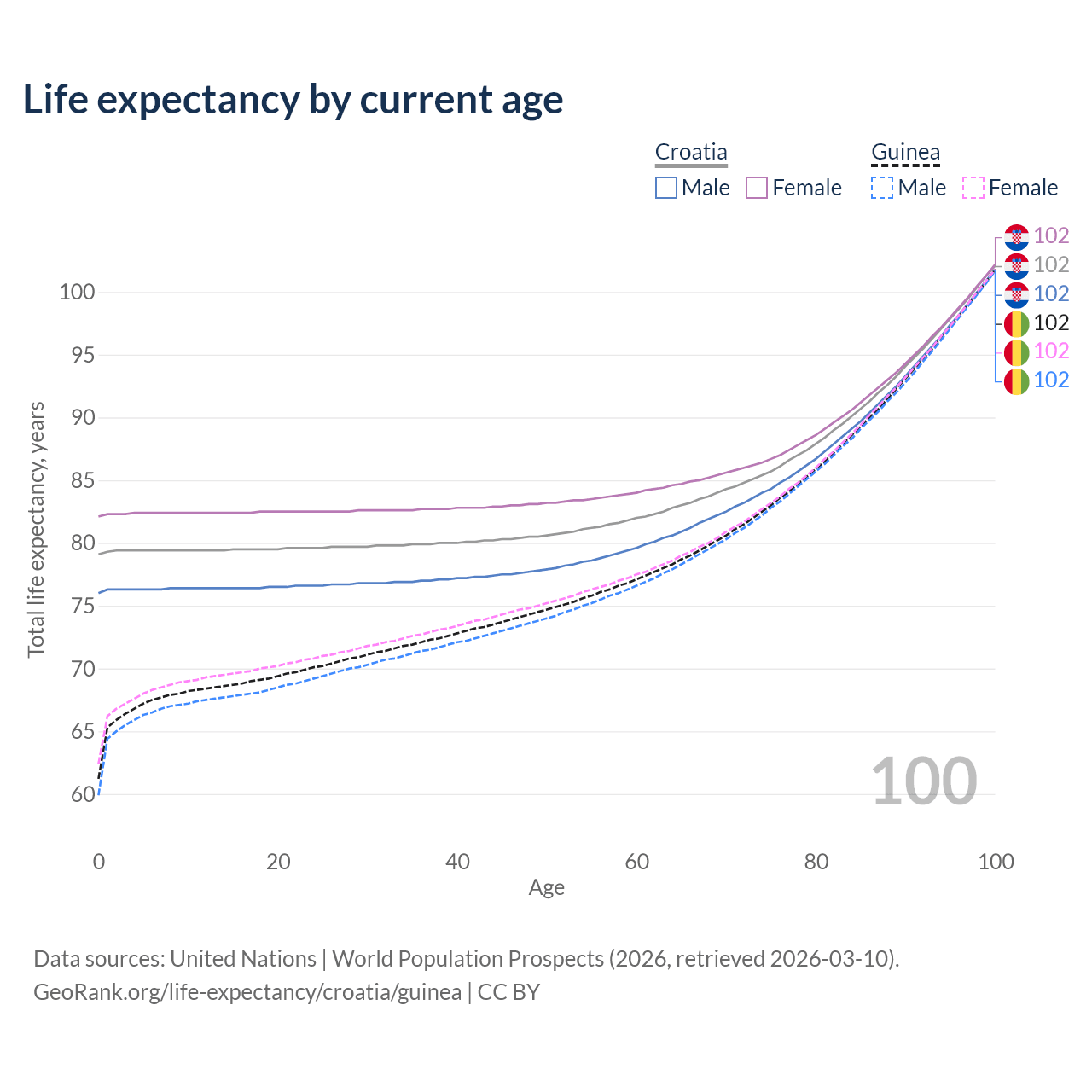 This life expectancy calculator shows the odds of living to 100, 95, 90, and below based on current age for both males and females in Croatia and Guinea, along with mean and median age of death. The calculations are based on the 2026 life tables (actuarial tables) from the UN World Population Prospects.