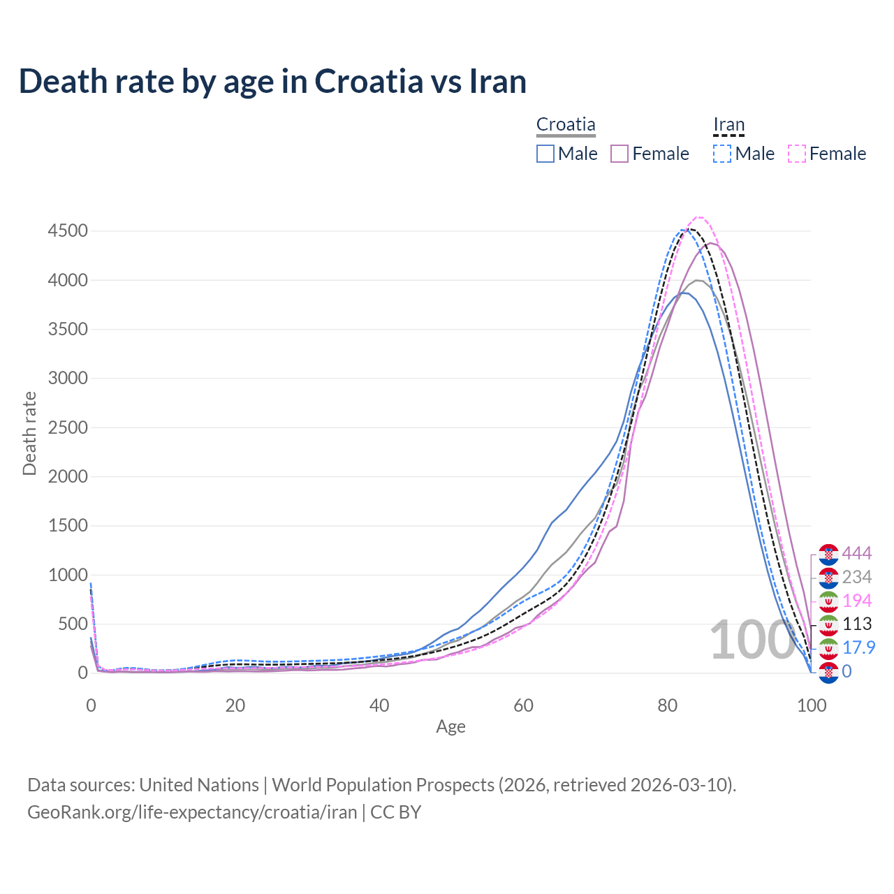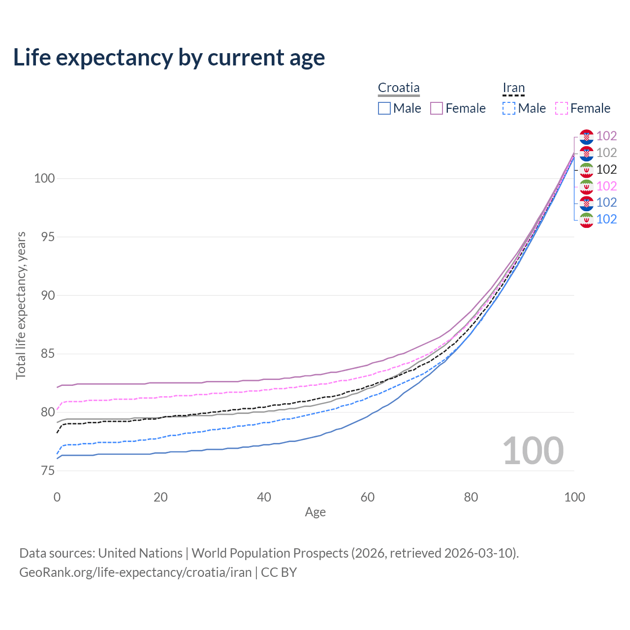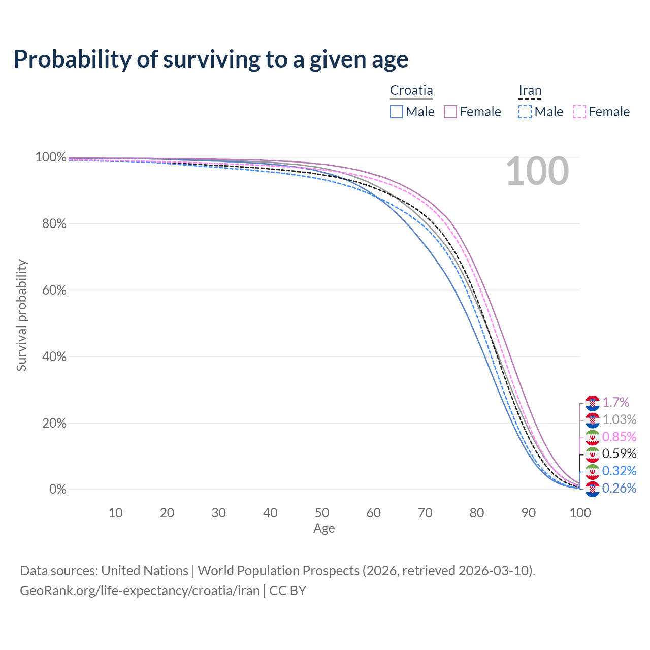 This life expectancy calculator shows the odds of living to 100, 95, 90, and below based on current age for both males and females in Croatia and Iran, along with mean and median age of death. The calculations are based on the 2026 life tables (actuarial tables) from the UN World Population Prospects.