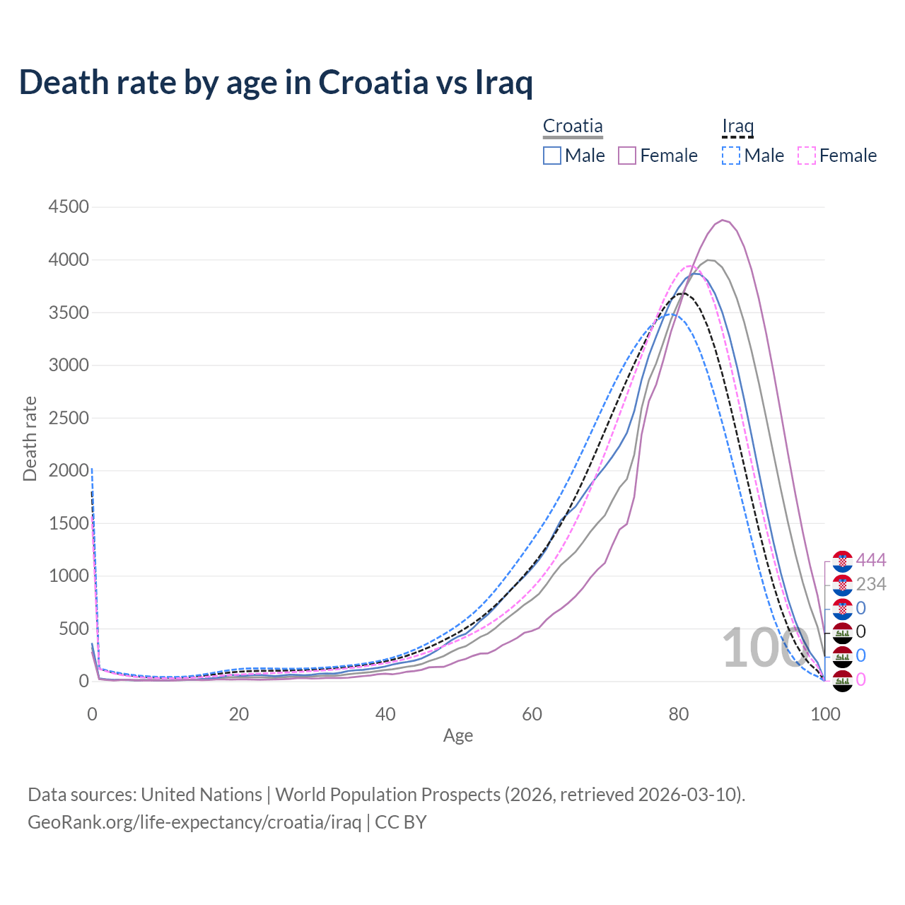 In Croatia, the most common age of death is 84, compared to 81 in Iraq. The median age of death is 81.7 in Croatia and 76.7 in Iraq, meaning only half of each cohort is expected to live past that age.