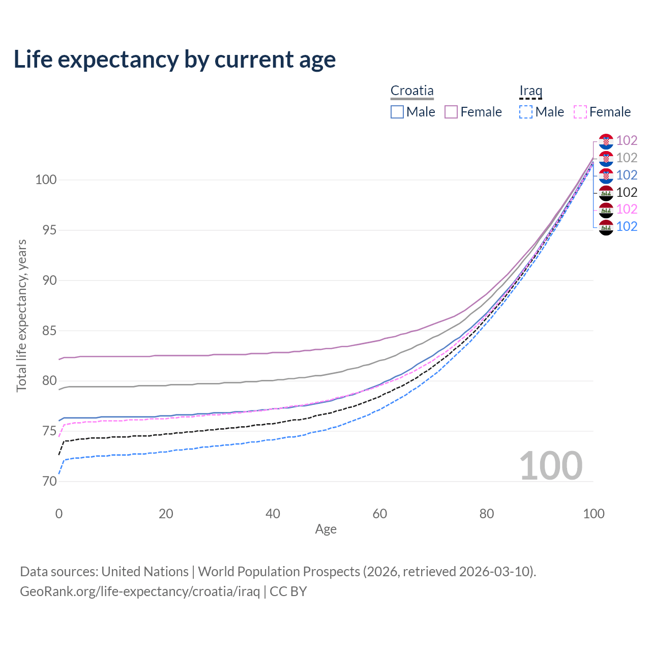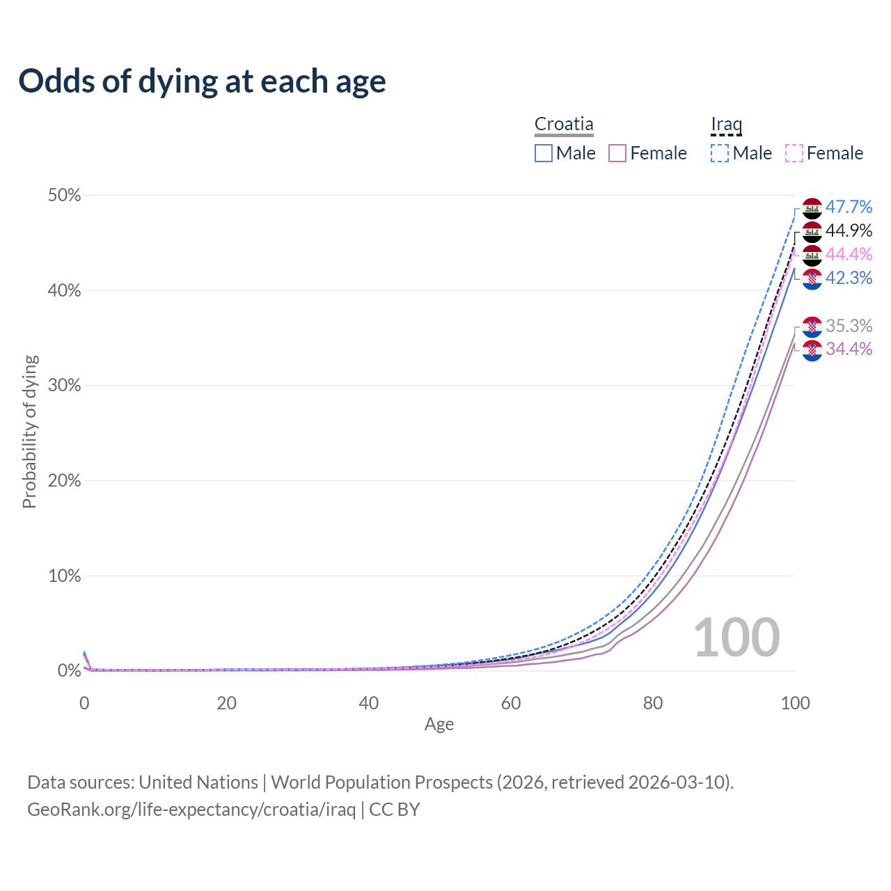 This life expectancy calculator shows the odds of living to 100, 95, 90, and below based on current age for both males and females in Croatia and Iraq, along with mean and median age of death. The calculations are based on the 2026 life tables (actuarial tables) from the UN World Population Prospects.
