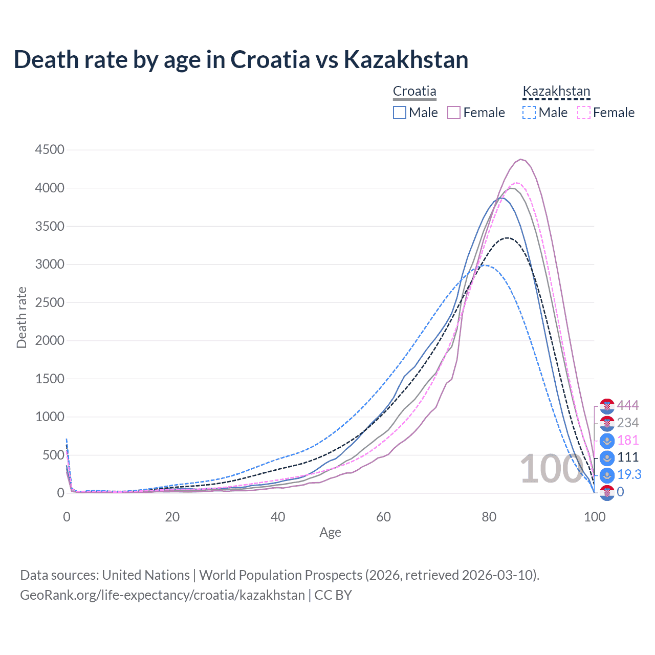 This life expectancy calculator shows the odds of living to 100, 95, 90, and below based on current age for both males and females in Croatia and Kazakhstan, along with mean and median age of death. The calculations are based on the 2026 life tables (actuarial tables) from the UN World Population Prospects.