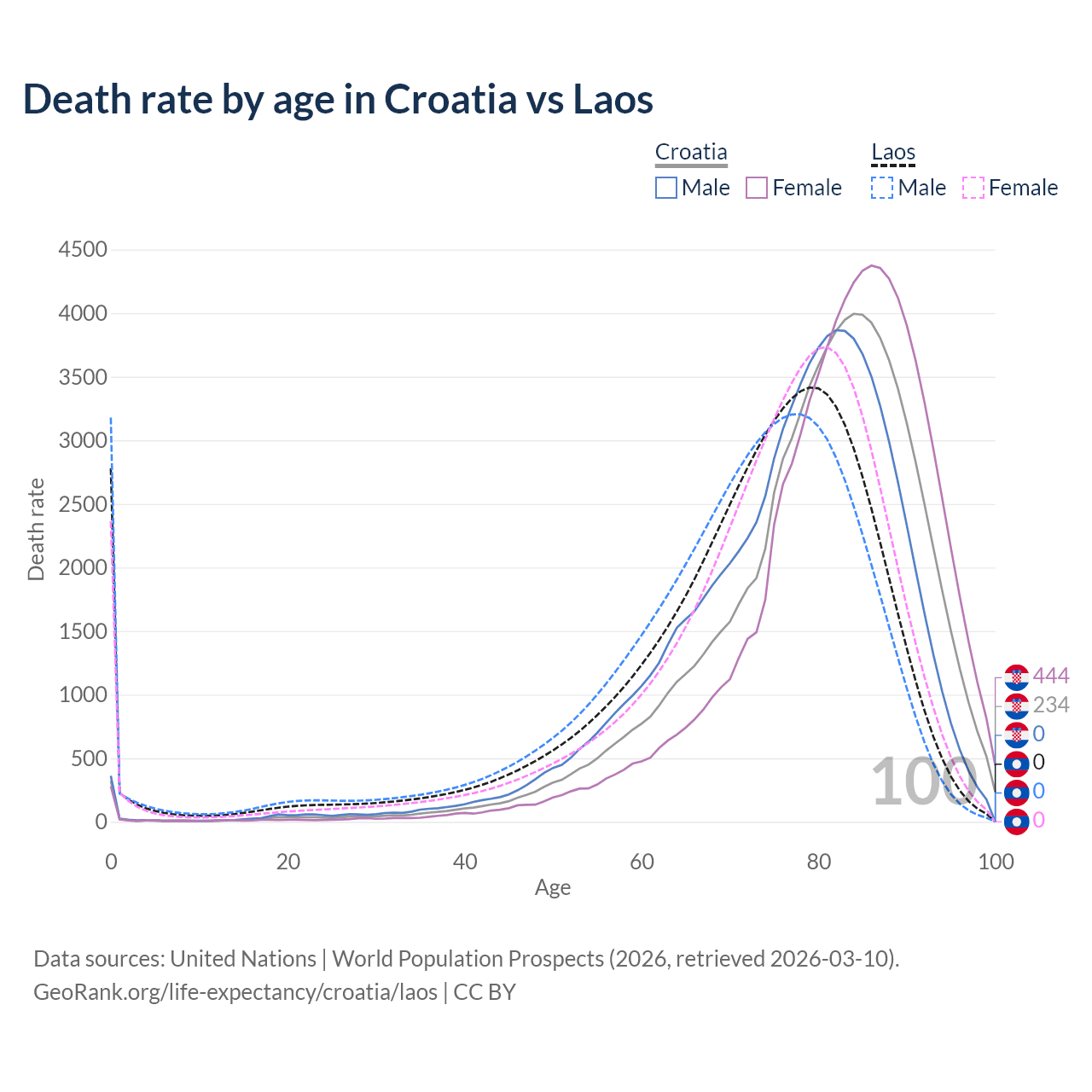 In Croatia, the most common age of death is 84, compared to 79 in Laos. The median age of death is 81.7 in Croatia and 74.7 in Laos, meaning only half of each cohort is expected to live past that age.