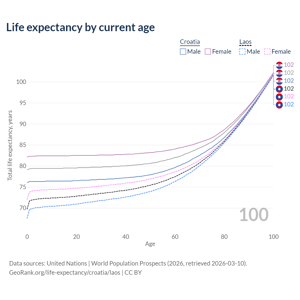 This life expectancy calculator shows the odds of living to 100, 95, 90, and below based on current age for both males and females in Croatia and Laos, along with mean and median age of death. The calculations are based on the 2026 life tables (actuarial tables) from the UN World Population Prospects.
