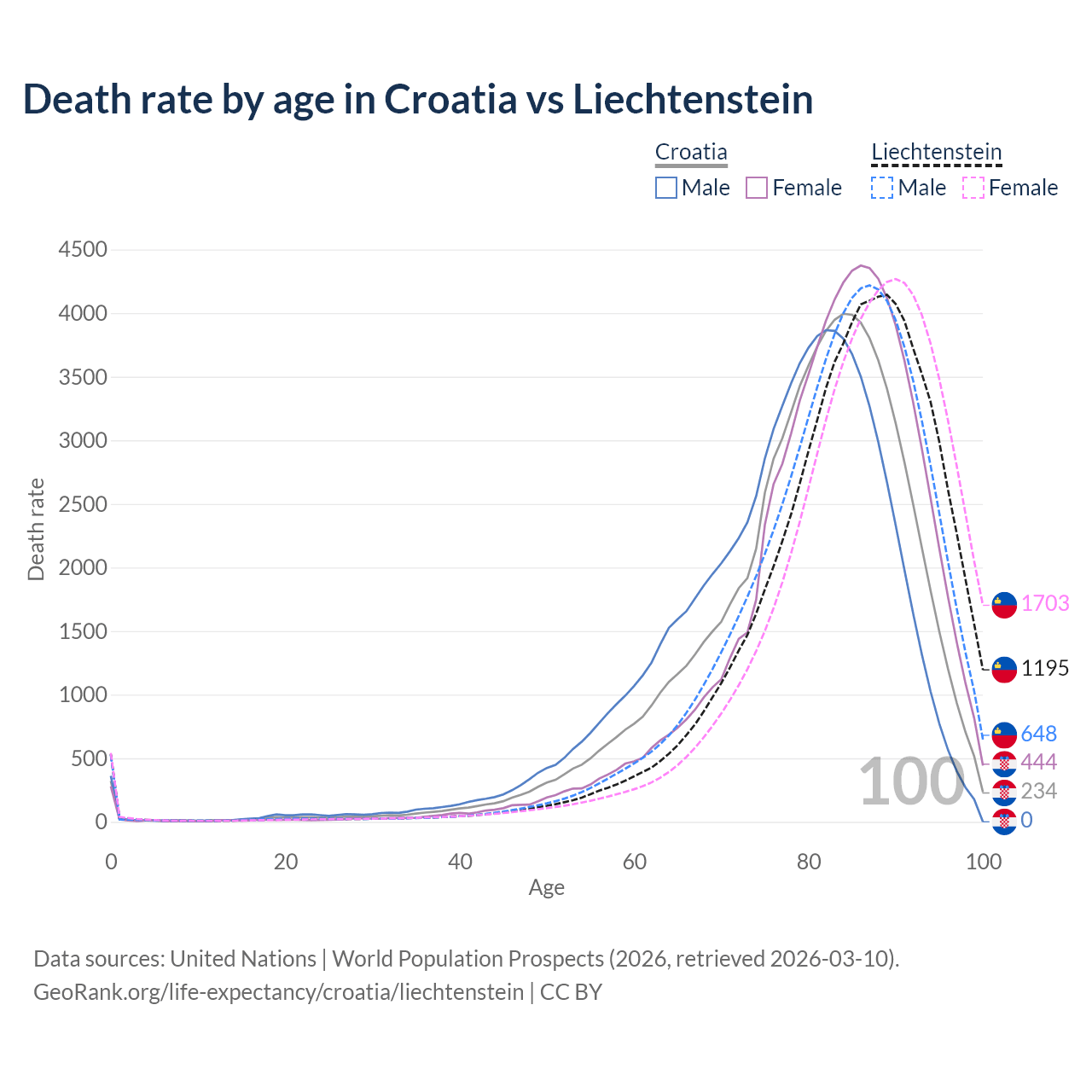 In Croatia, the most common age of death is 84, compared to 89 in Liechtenstein. The median age of death is 81.7 in Croatia and 86.3 in Liechtenstein, meaning only half of each cohort is expected to live past that age.