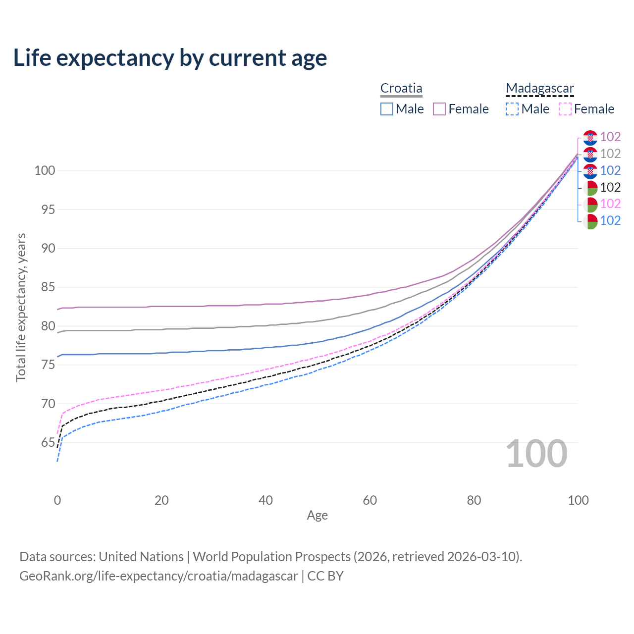 This life expectancy calculator shows the odds of living to 100, 95, 90, and below based on current age for both males and females in Croatia and Madagascar, along with mean and median age of death. The calculations are based on the 2026 life tables (actuarial tables) from the UN World Population Prospects.