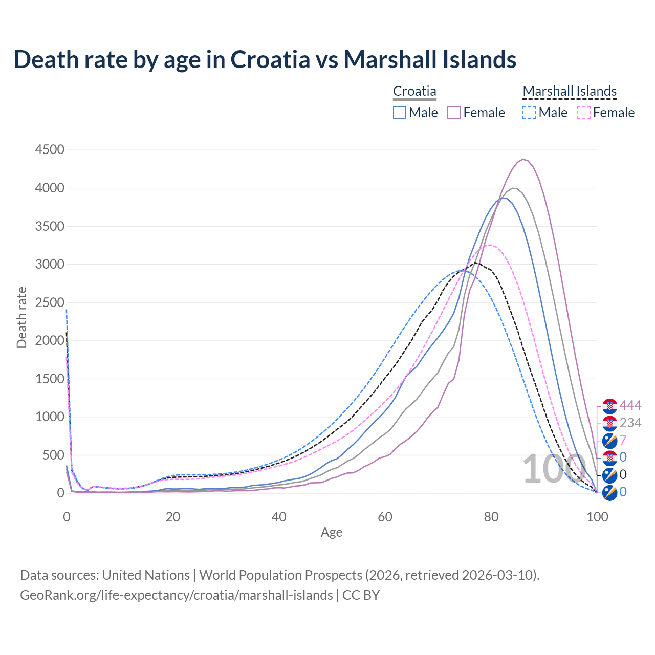 In Croatia, the most common age of death is 84, compared to 77 in the Marshall Islands. The median age of death is 81.7 in Croatia and 72 in the Marshall Islands, meaning only half of each cohort is expected to live past that age.
