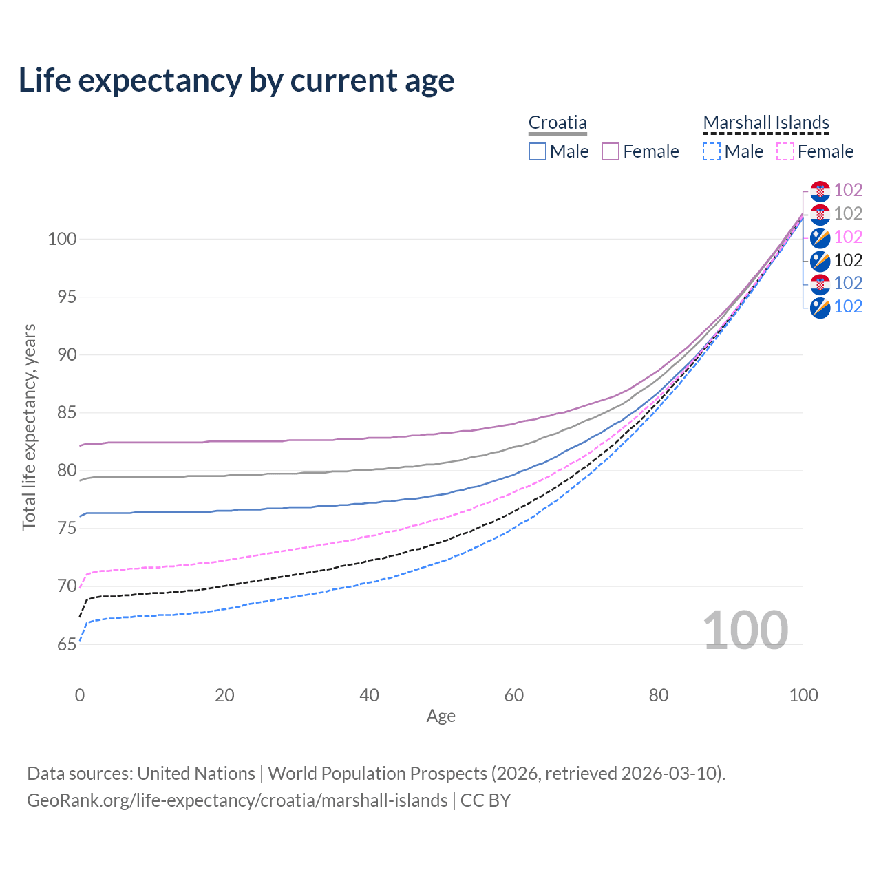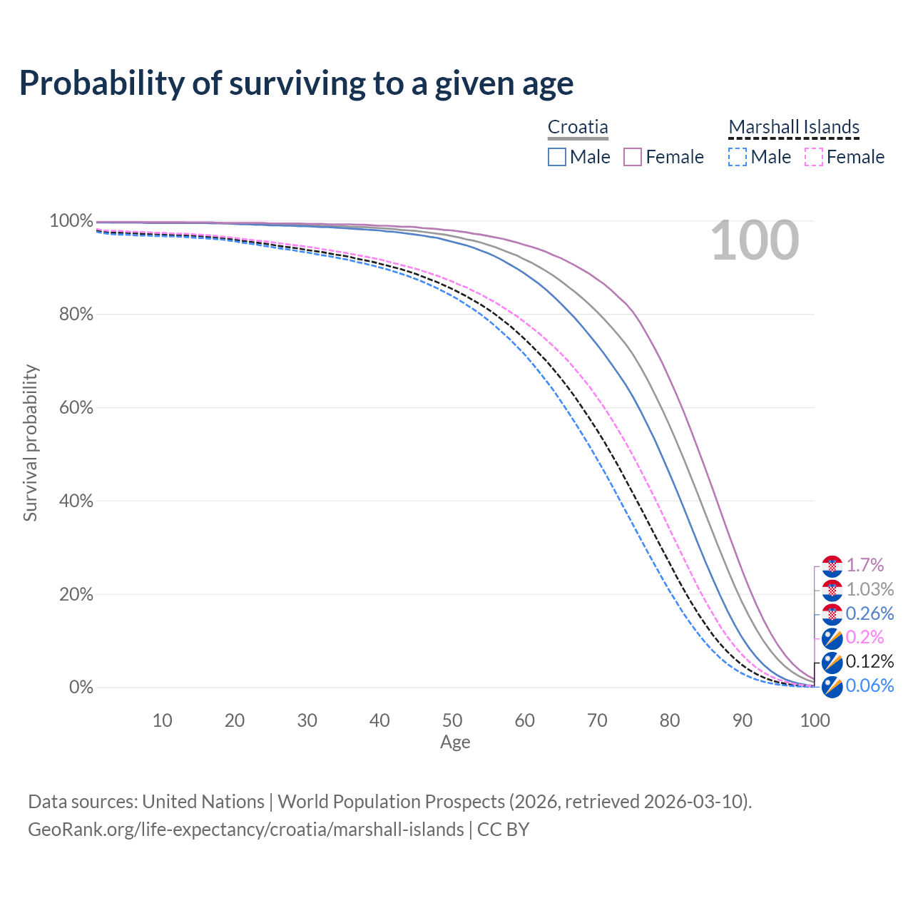 This life expectancy calculator shows the odds of living to 100, 95, 90, and below based on current age for both males and females in Croatia and the Marshall Islands, along with mean and median age of death. The calculations are based on the 2026 life tables (actuarial tables) from the UN World Population Prospects.