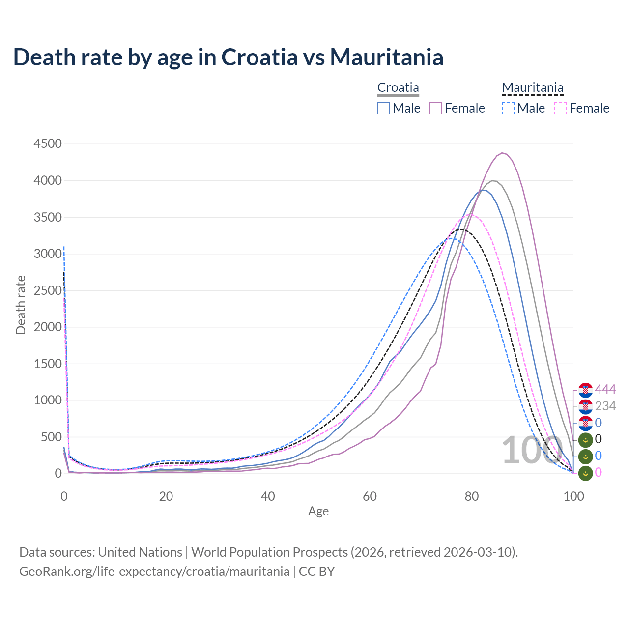 In Croatia, the most common age of death is 84, compared to 78 in Mauritania. The median age of death is 81.7 in Croatia and 74.1 in Mauritania, meaning only half of each cohort is expected to live past that age.