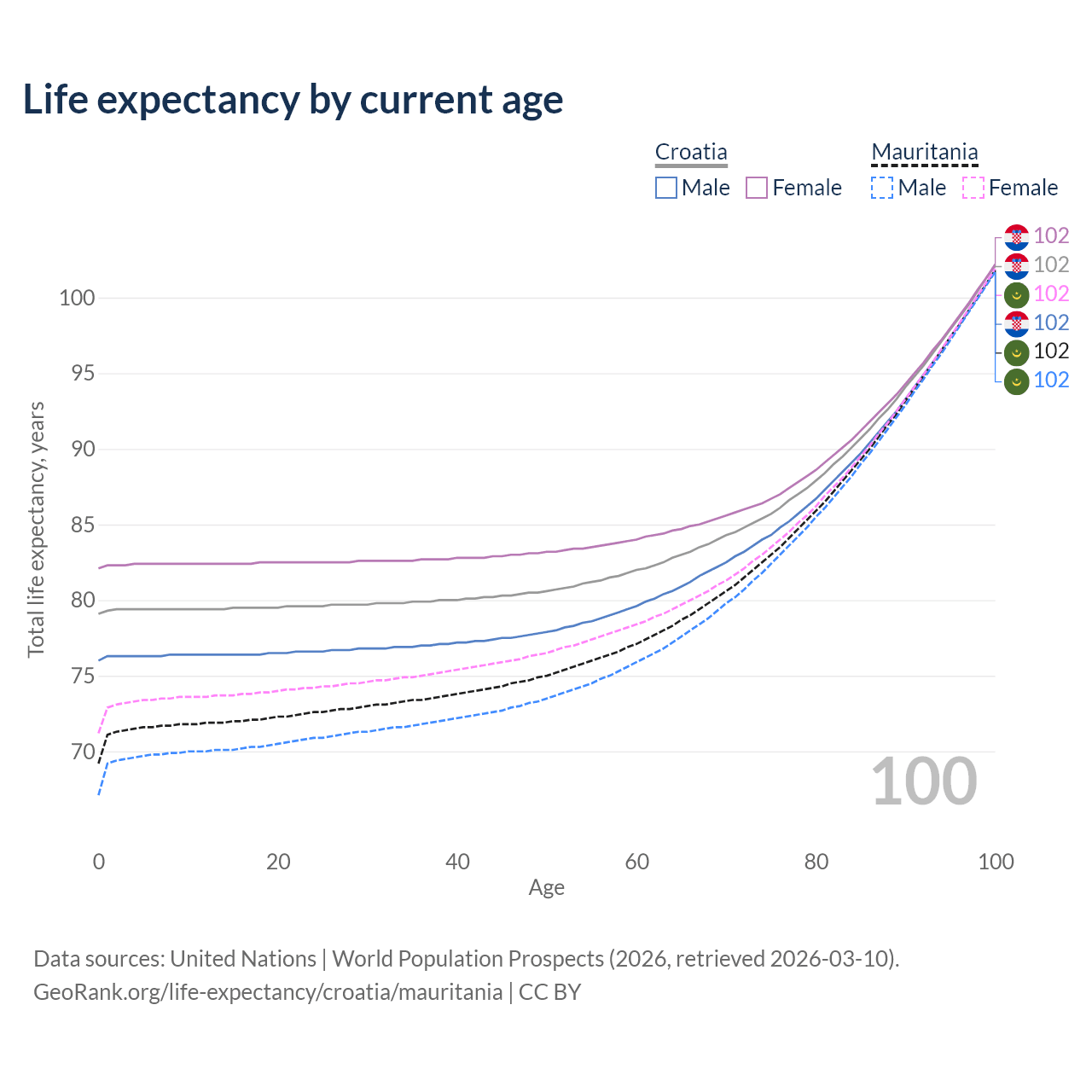 This life expectancy calculator shows the odds of living to 100, 95, 90, and below based on current age for both males and females in Croatia and Mauritania, along with mean and median age of death. The calculations are based on the 2026 life tables (actuarial tables) from the UN World Population Prospects.