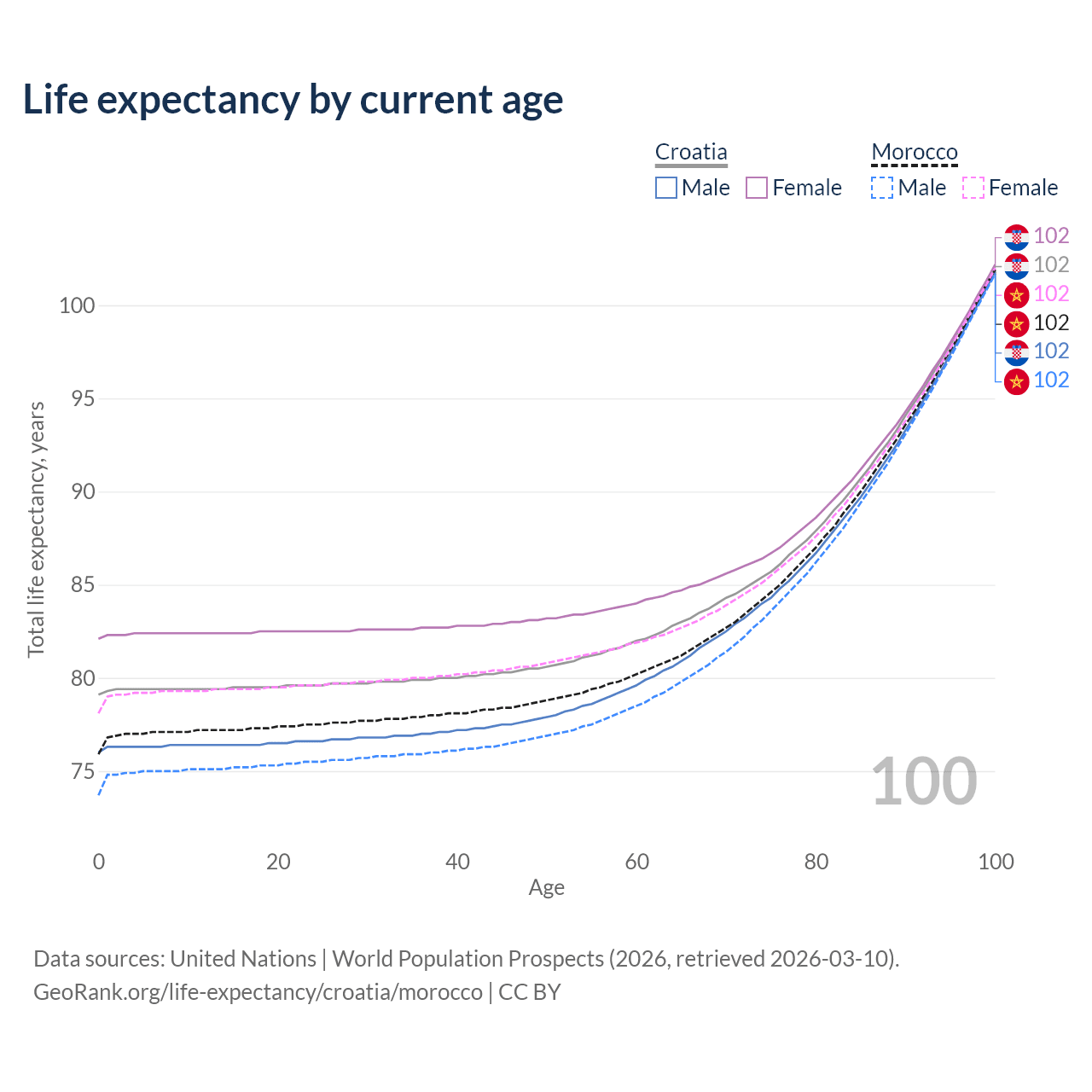 This life expectancy calculator shows the odds of living to 100, 95, 90, and below based on current age for both males and females in Croatia and Morocco, along with mean and median age of death. The calculations are based on the 2026 life tables (actuarial tables) from the UN World Population Prospects.