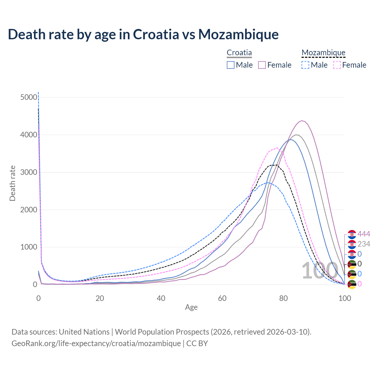 In Croatia, the most common age of death is 84, compared to 0 in Mozambique. The median age of death is 81.7 in Croatia and 71.2 in Mozambique, meaning only half of each cohort is expected to live past that age.