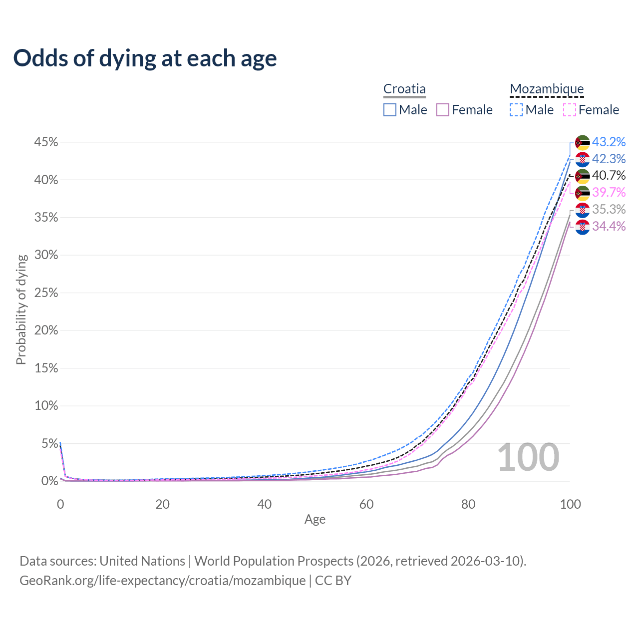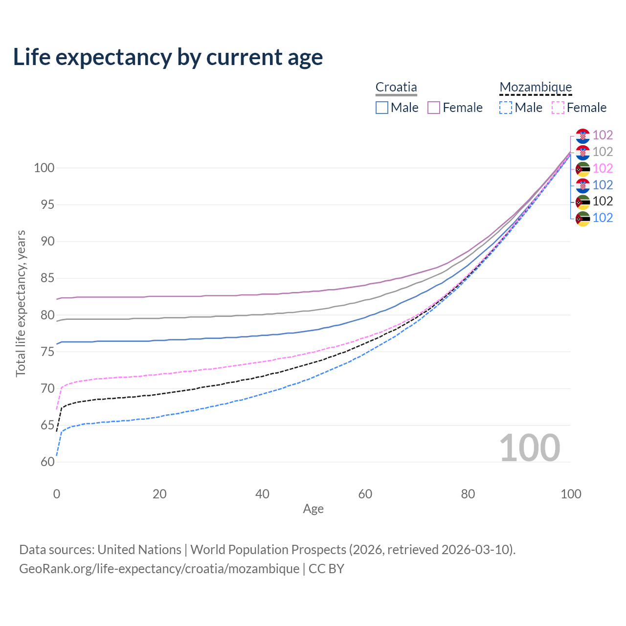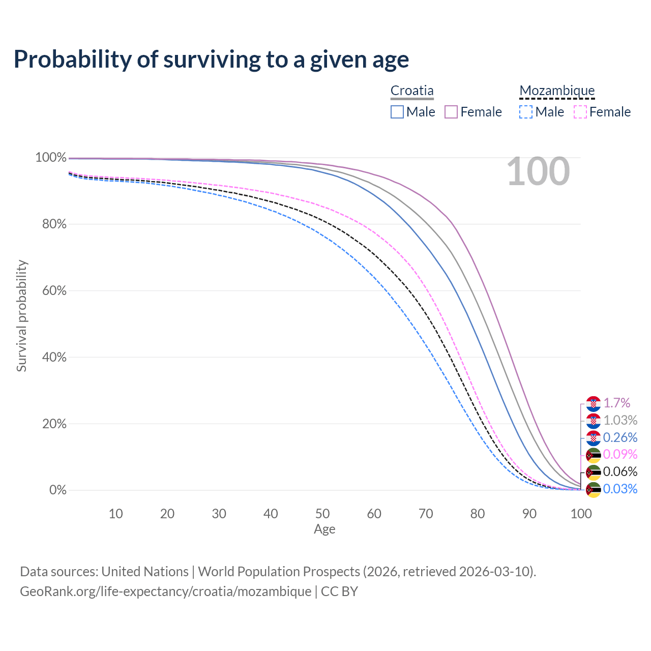 This life expectancy calculator shows the odds of living to 100, 95, 90, and below based on current age for both males and females in Croatia and Mozambique, along with mean and median age of death. The calculations are based on the 2026 life tables (actuarial tables) from the UN World Population Prospects.