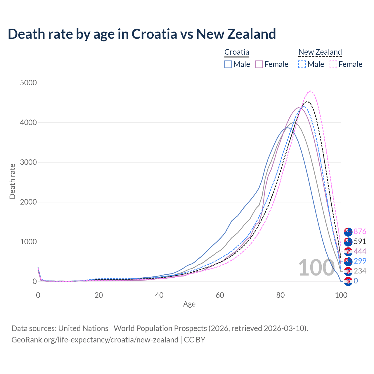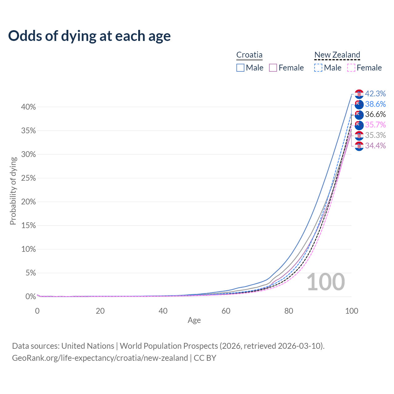 This life expectancy calculator shows the odds of living to 100, 95, 90, and below based on current age for both males and females in Croatia and New Zealand, along with mean and median age of death. The calculations are based on the 2026 life tables (actuarial tables) from the UN World Population Prospects.