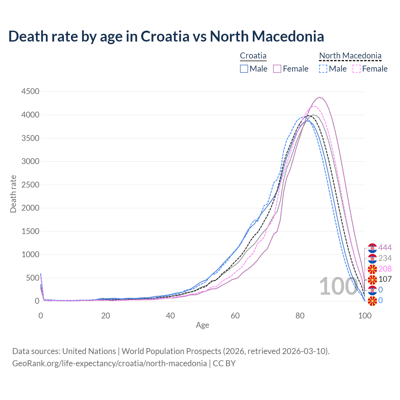 This life expectancy calculator shows the odds of living to 100, 95, 90, and below based on current age for both males and females in Croatia and North Macedonia, along with mean and median age of death. The calculations are based on the 2026 life tables (actuarial tables) from the UN World Population Prospects.