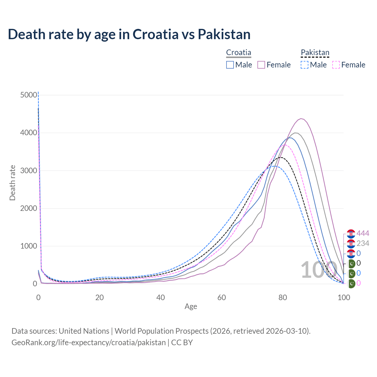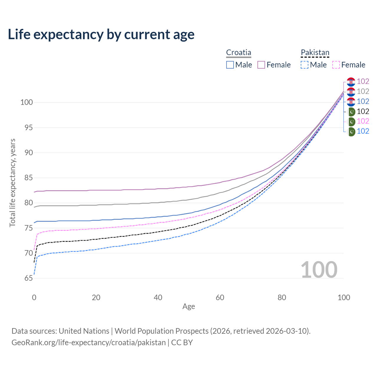 This life expectancy calculator shows the odds of living to 100, 95, 90, and below based on current age for both males and females in Croatia and Pakistan, along with mean and median age of death. The calculations are based on the 2026 life tables (actuarial tables) from the UN World Population Prospects.
