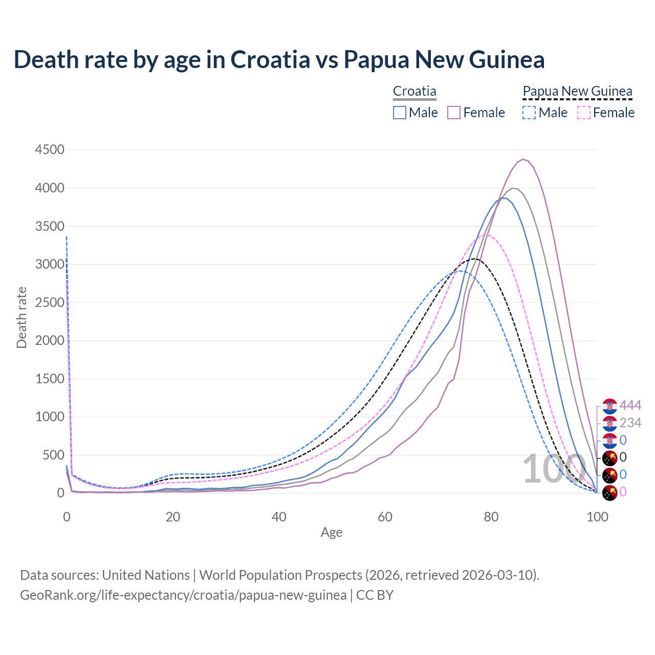 In Croatia, the most common age of death is 84, compared to 0 in Papua New Guinea. The median age of death is 81.7 in Croatia and 71.7 in Papua New Guinea, meaning only half of each cohort is expected to live past that age.