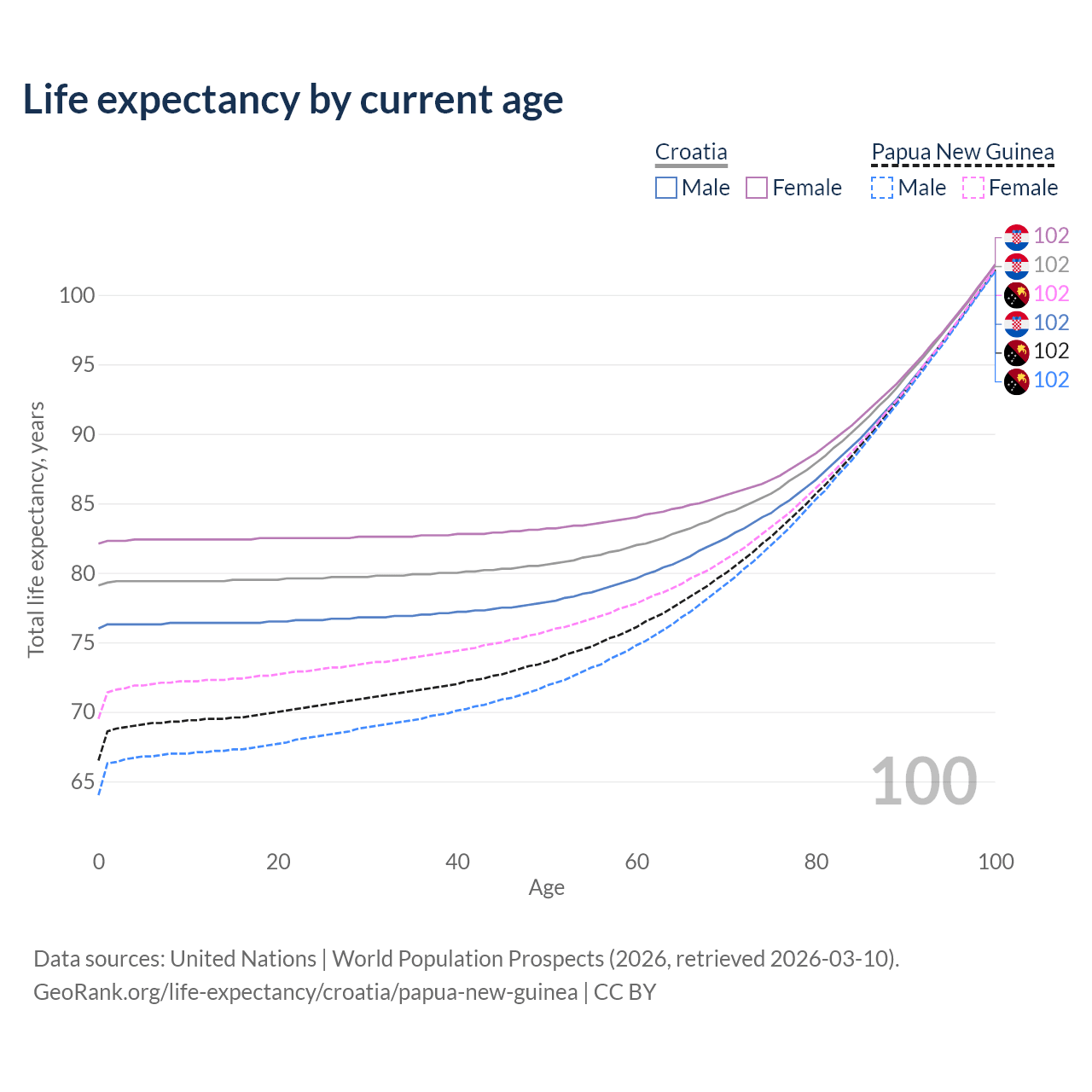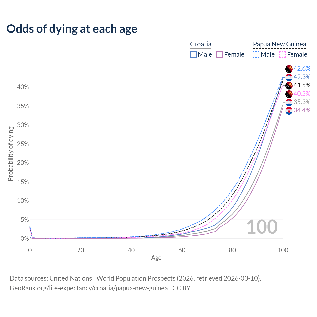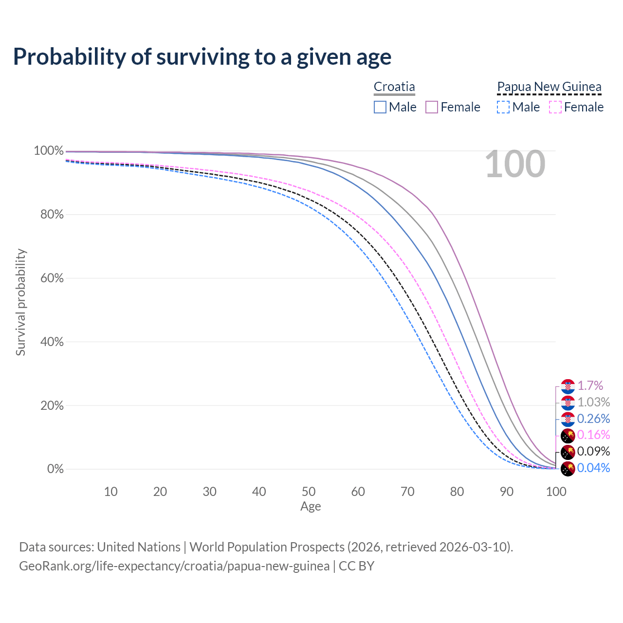 This life expectancy calculator shows the odds of living to 100, 95, 90, and below based on current age for both males and females in Croatia and Papua New Guinea, along with mean and median age of death. The calculations are based on the 2026 life tables (actuarial tables) from the UN World Population Prospects.