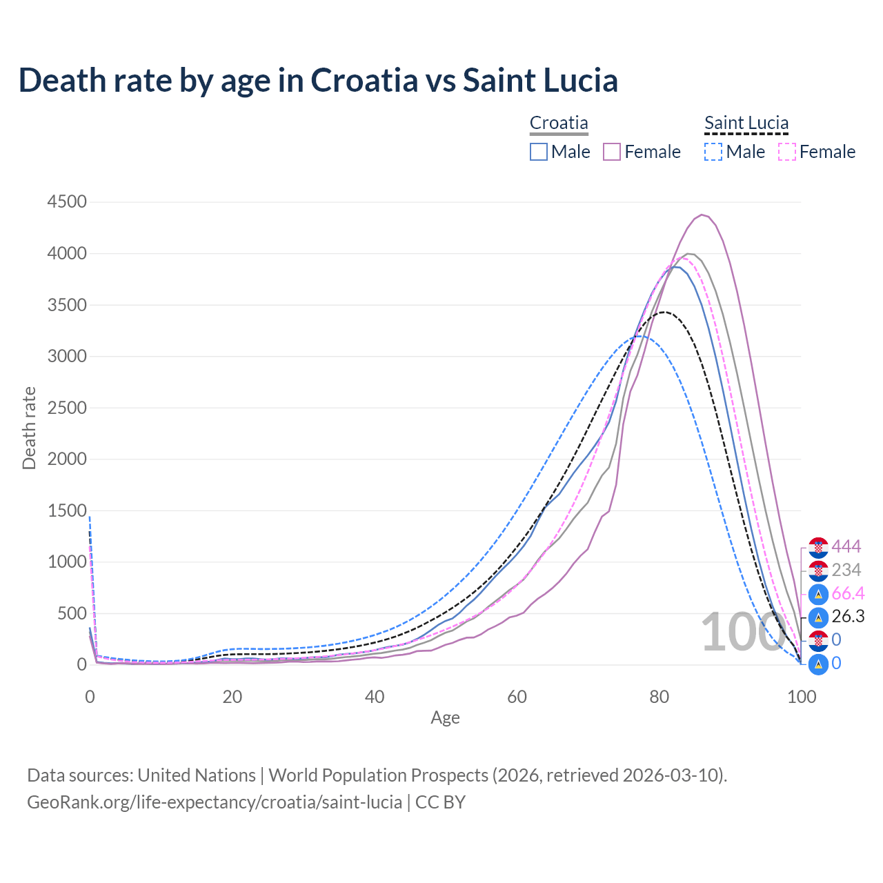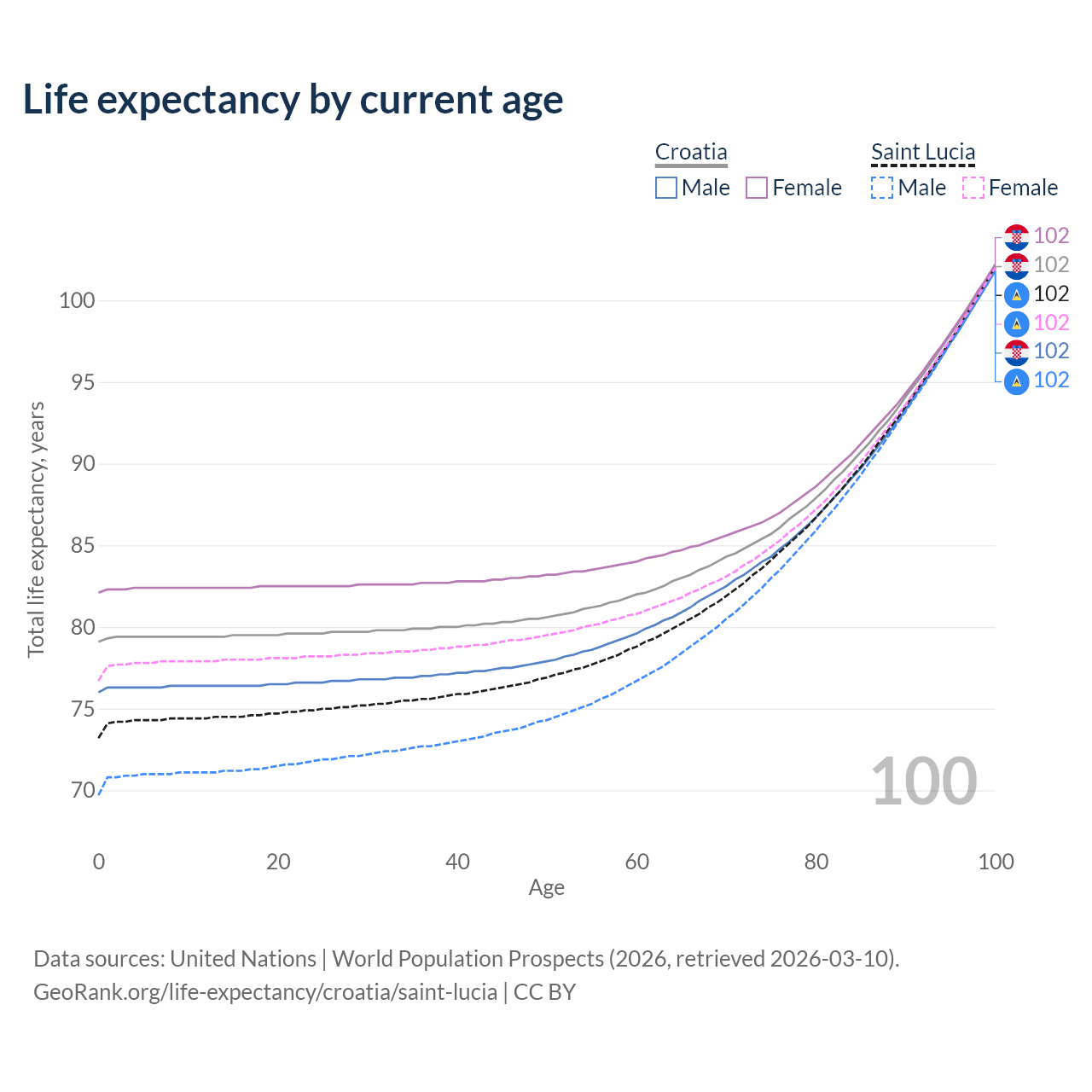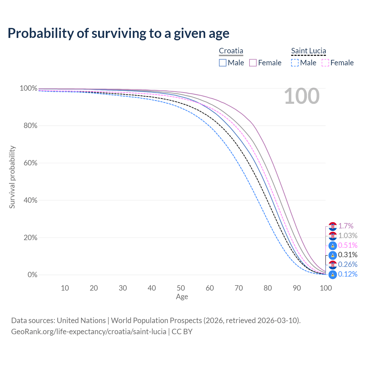 This life expectancy calculator shows the odds of living to 100, 95, 90, and below based on current age for both males and females in Croatia and Saint Lucia, along with mean and median age of death. The calculations are based on the 2026 life tables (actuarial tables) from the UN World Population Prospects.