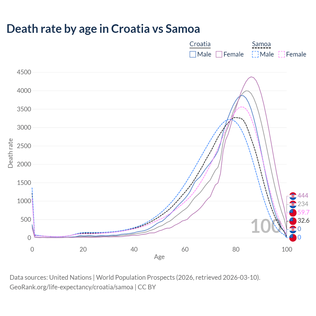 In Croatia, the most common age of death is 84, compared to 80 in Samoa. The median age of death is 81.7 in Croatia and 75.9 in Samoa, meaning only half of each cohort is expected to live past that age.