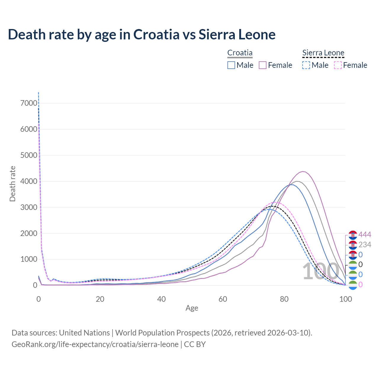 In Croatia, the most common age of death is 84, compared to 0 in Sierra Leone. The median age of death is 81.7 in Croatia and 70.8 in Sierra Leone, meaning only half of each cohort is expected to live past that age.
