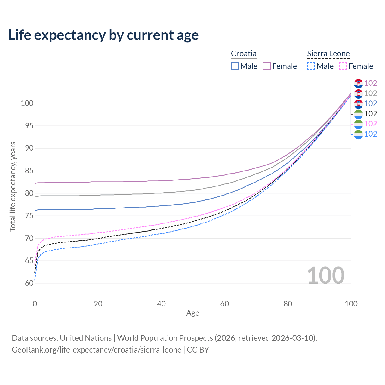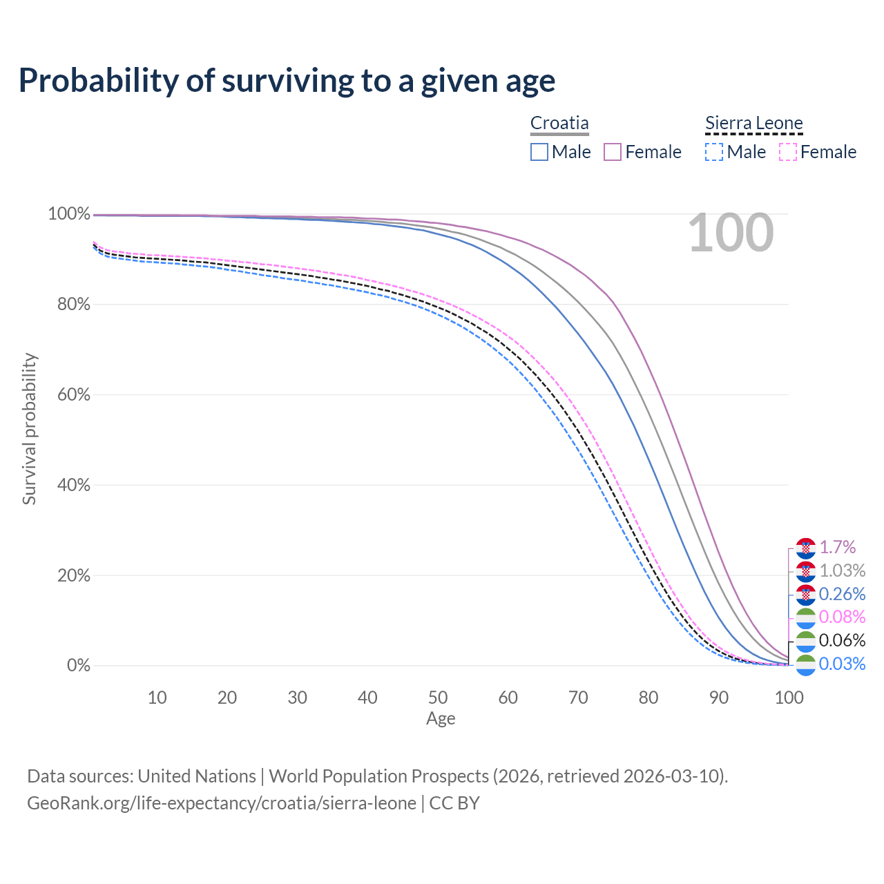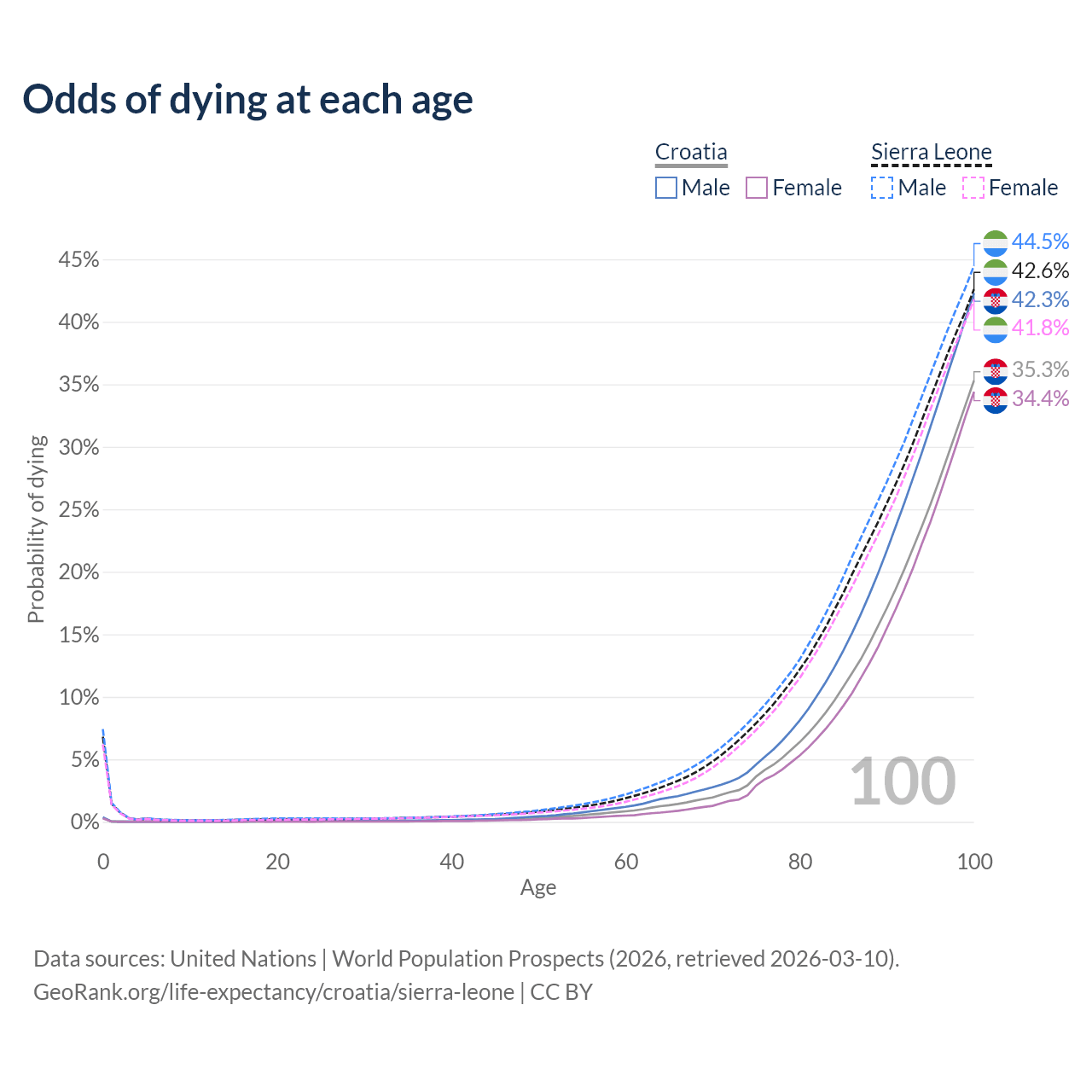 This life expectancy calculator shows the odds of living to 100, 95, 90, and below based on current age for both males and females in Croatia and Sierra Leone, along with mean and median age of death. The calculations are based on the 2026 life tables (actuarial tables) from the UN World Population Prospects.
