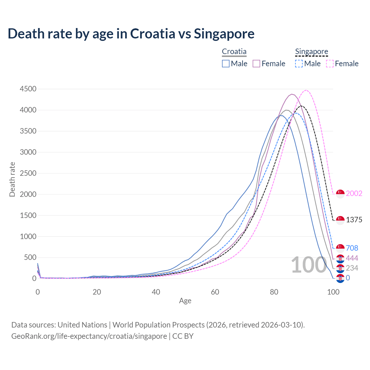 In Croatia, the most common age of death is 84, compared to 89 in Singapore. The median age of death is 81.7 in Croatia and 86.5 in Singapore, meaning only half of each cohort is expected to live past that age.