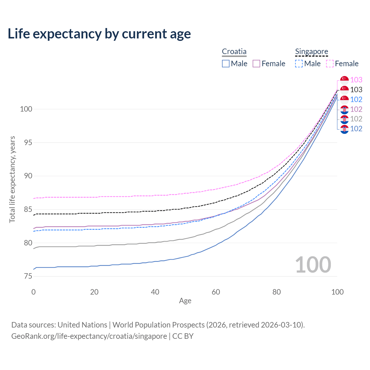 This life expectancy calculator shows the odds of living to 100, 95, 90, and below based on current age for both males and females in Croatia and Singapore, along with mean and median age of death. The calculations are based on the 2026 life tables (actuarial tables) from the UN World Population Prospects.