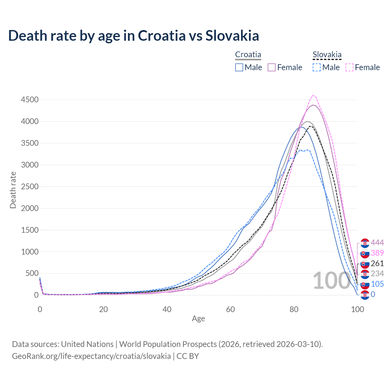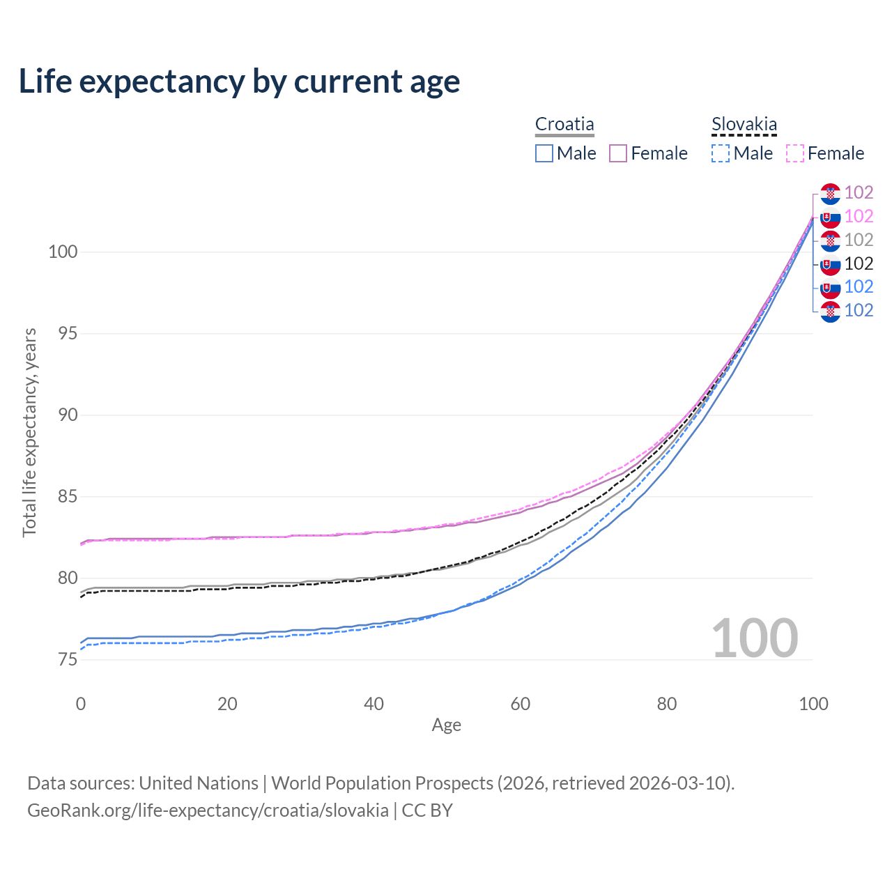 This life expectancy calculator shows the odds of living to 100, 95, 90, and below based on current age for both males and females in Croatia and Slovakia, along with mean and median age of death. The calculations are based on the 2026 life tables (actuarial tables) from the UN World Population Prospects.
