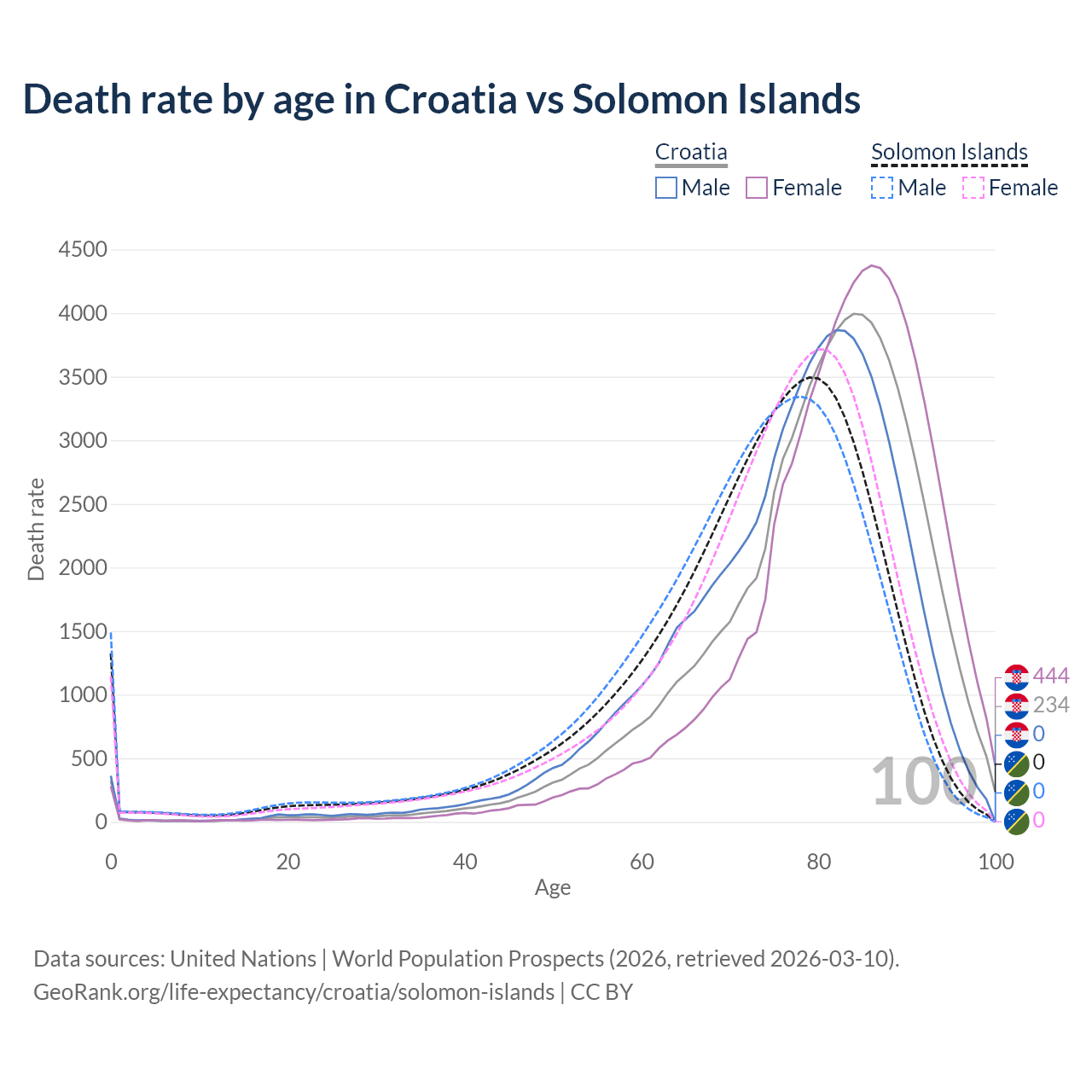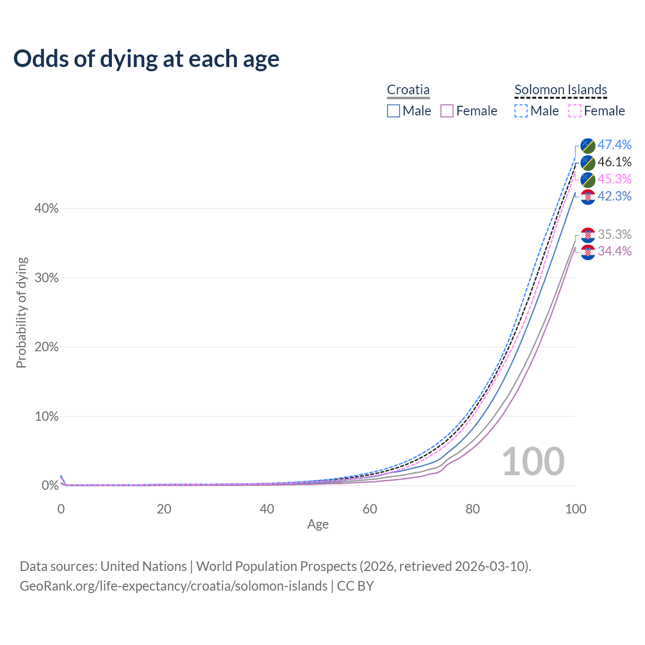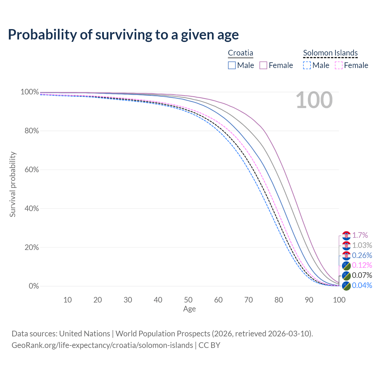 This life expectancy calculator shows the odds of living to 100, 95, 90, and below based on current age for both males and females in Croatia and the Solomon Islands, along with mean and median age of death. The calculations are based on the 2026 life tables (actuarial tables) from the UN World Population Prospects.