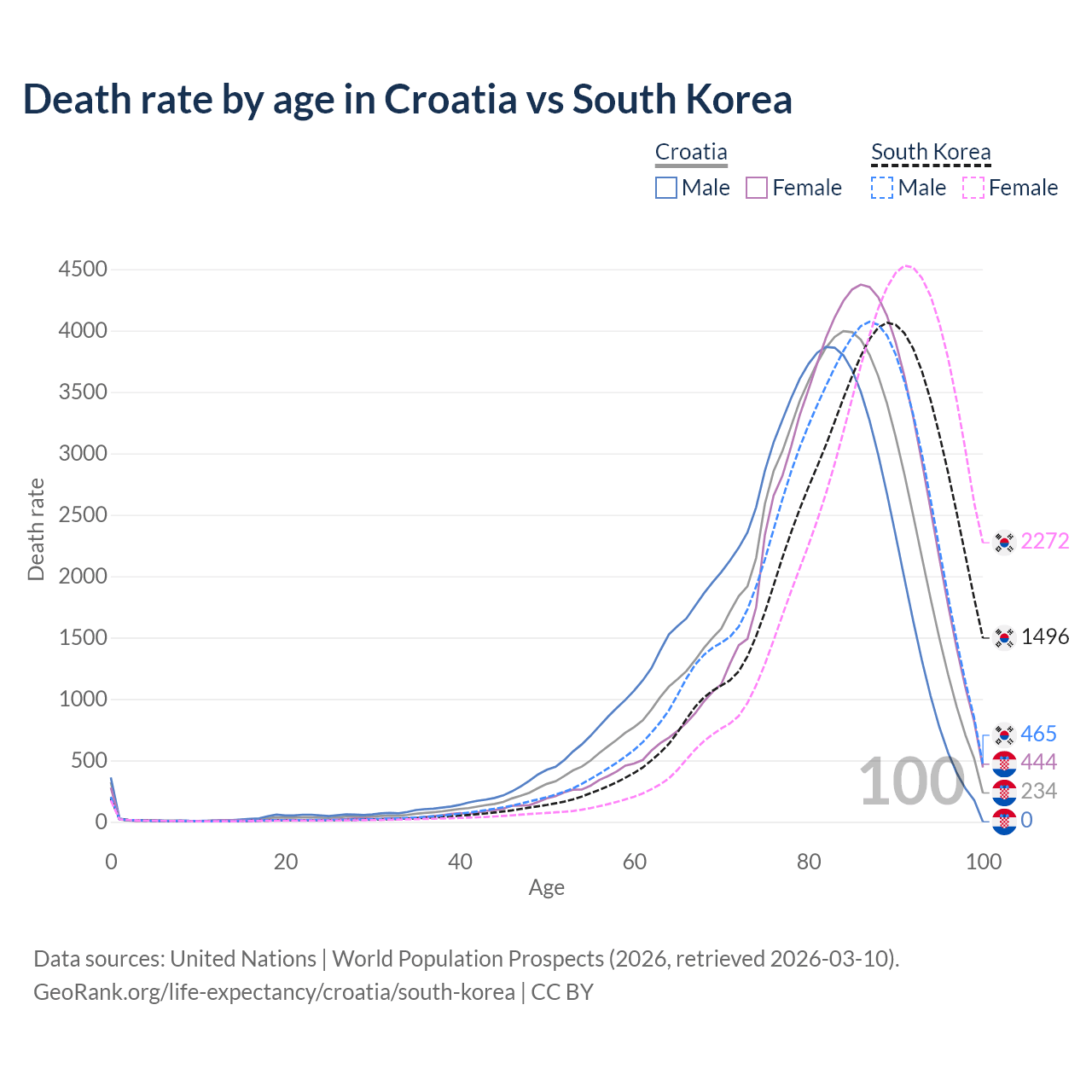 In Croatia, the most common age of death is 84, compared to 89 in South Korea. The median age of death is 81.7 in Croatia and 86.8 in South Korea, meaning only half of each cohort is expected to live past that age.