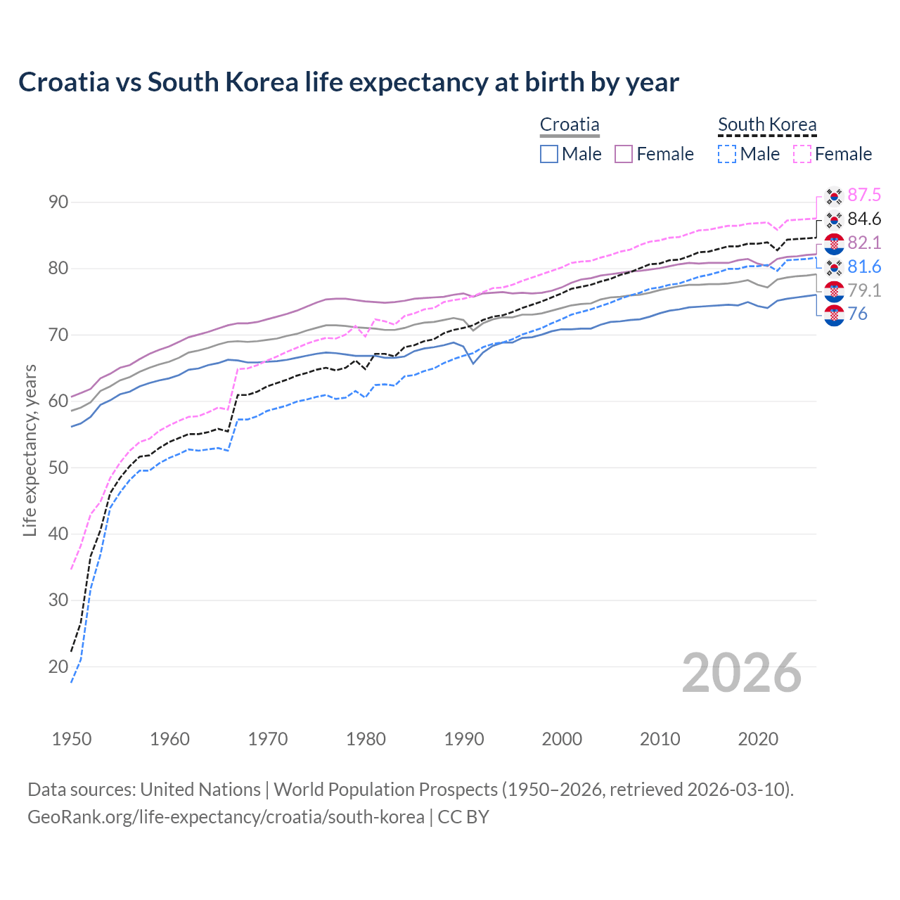 The average life expectancy at birth is 79.1 years in Croatia vs 84.6 in South Korea. Croatia is ranked 51/197 by life expectancy, and South Korea is 4/197. In Croatia, the life expectancy is 76 years for males and 82.1 years for females. In South Korea, it's 81.6 years for males and 87.5 years for females.
