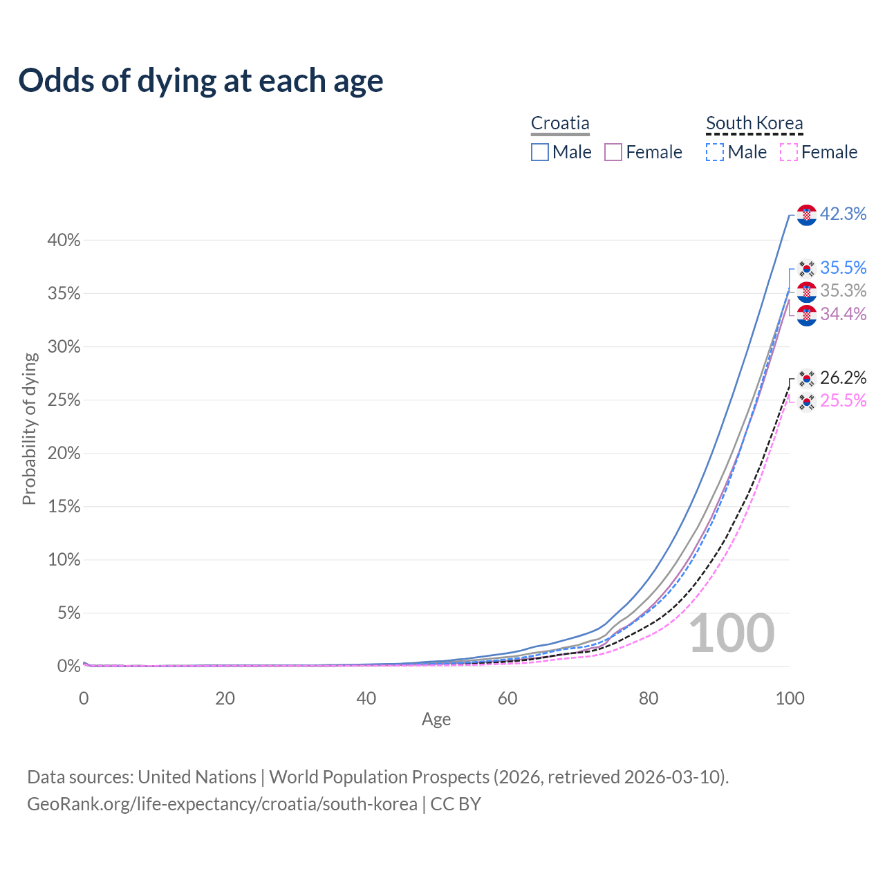 This life expectancy calculator shows the odds of living to 100, 95, 90, and below based on current age for both males and females in Croatia and South Korea, along with mean and median age of death. The calculations are based on the 2026 life tables (actuarial tables) from the UN World Population Prospects.