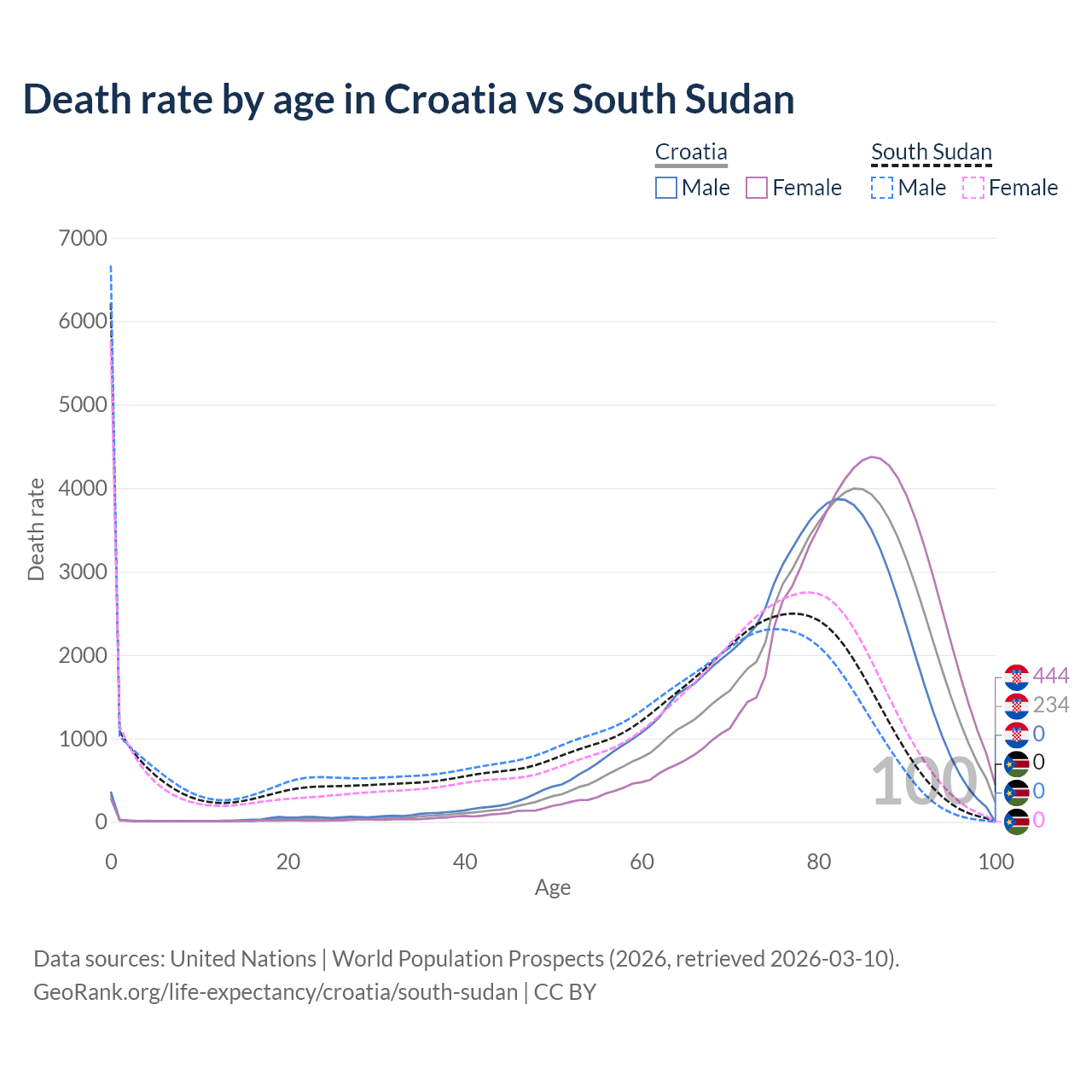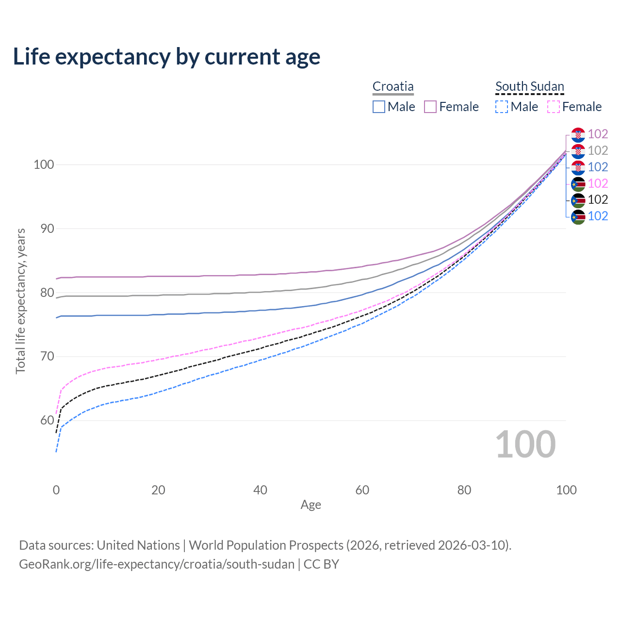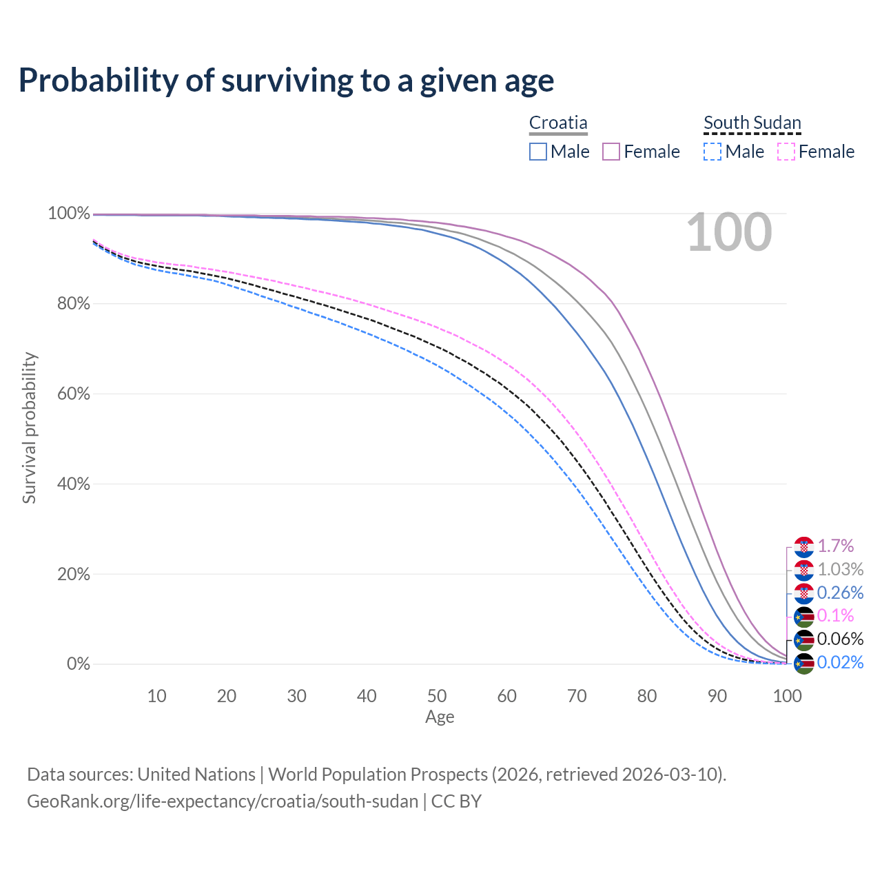 This life expectancy calculator shows the odds of living to 100, 95, 90, and below based on current age for both males and females in Croatia and South Sudan, along with mean and median age of death. The calculations are based on the 2026 life tables (actuarial tables) from the UN World Population Prospects.