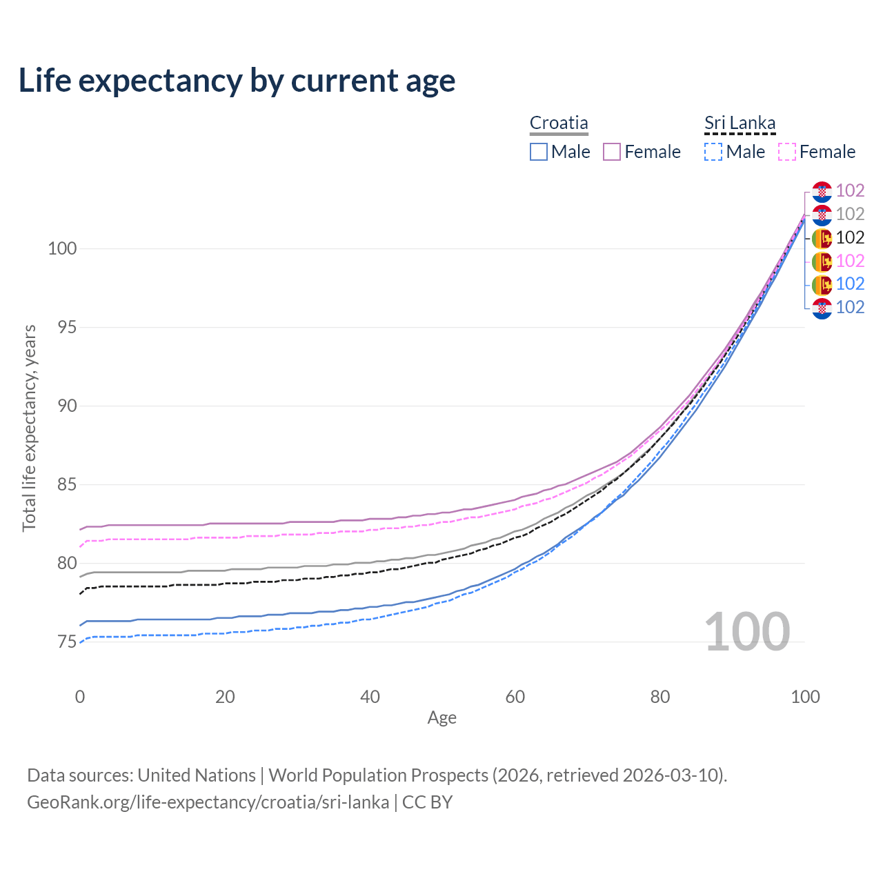 This life expectancy calculator shows the odds of living to 100, 95, 90, and below based on current age for both males and females in Croatia and Sri Lanka, along with mean and median age of death. The calculations are based on the 2026 life tables (actuarial tables) from the UN World Population Prospects.