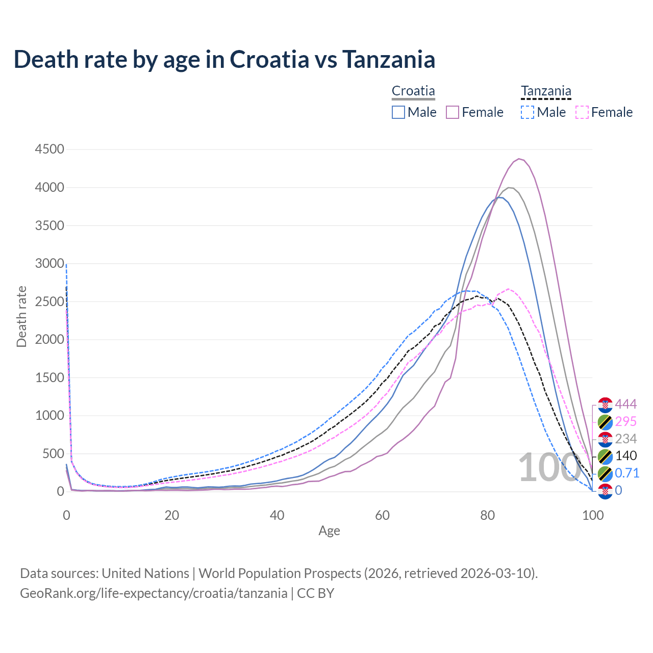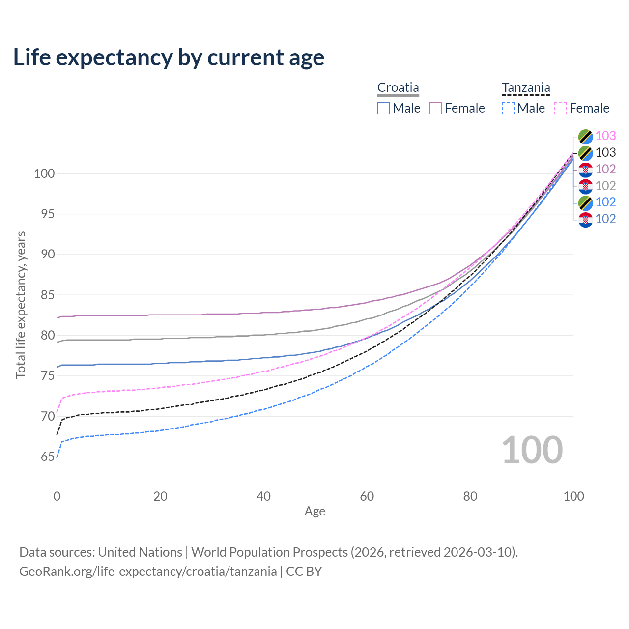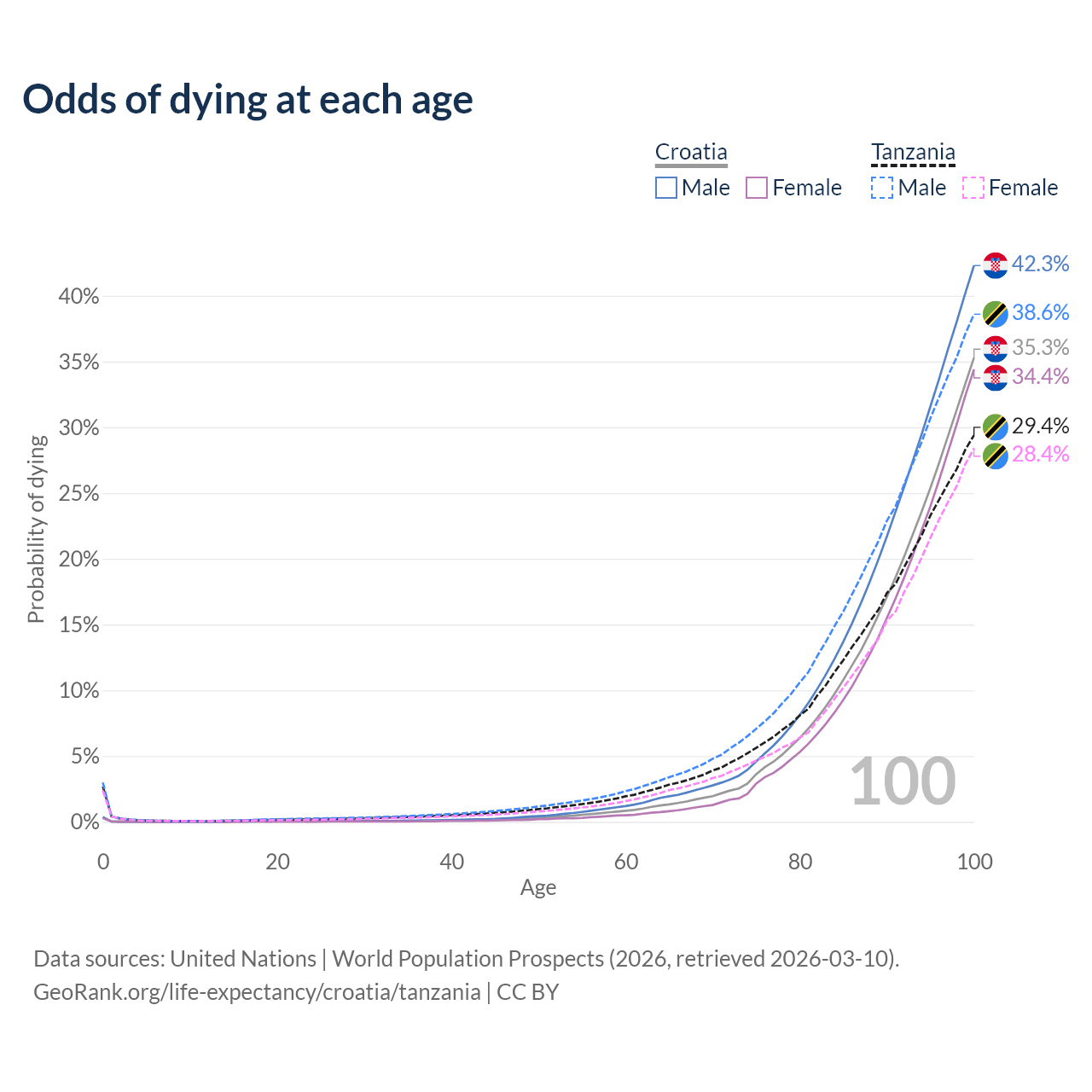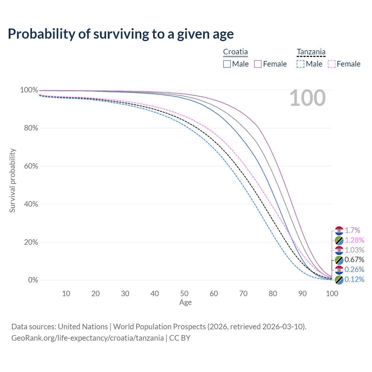 This life expectancy calculator shows the odds of living to 100, 95, 90, and below based on current age for both males and females in Croatia and Tanzania, along with mean and median age of death. The calculations are based on the 2026 life tables (actuarial tables) from the UN World Population Prospects.