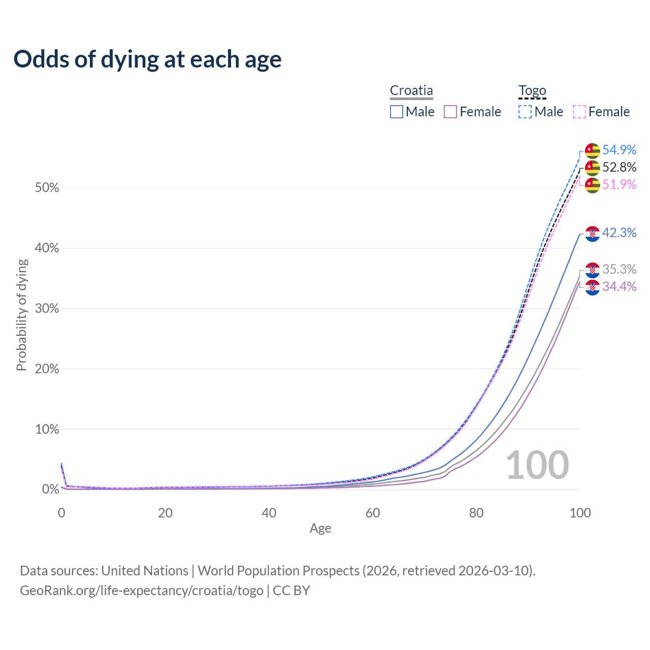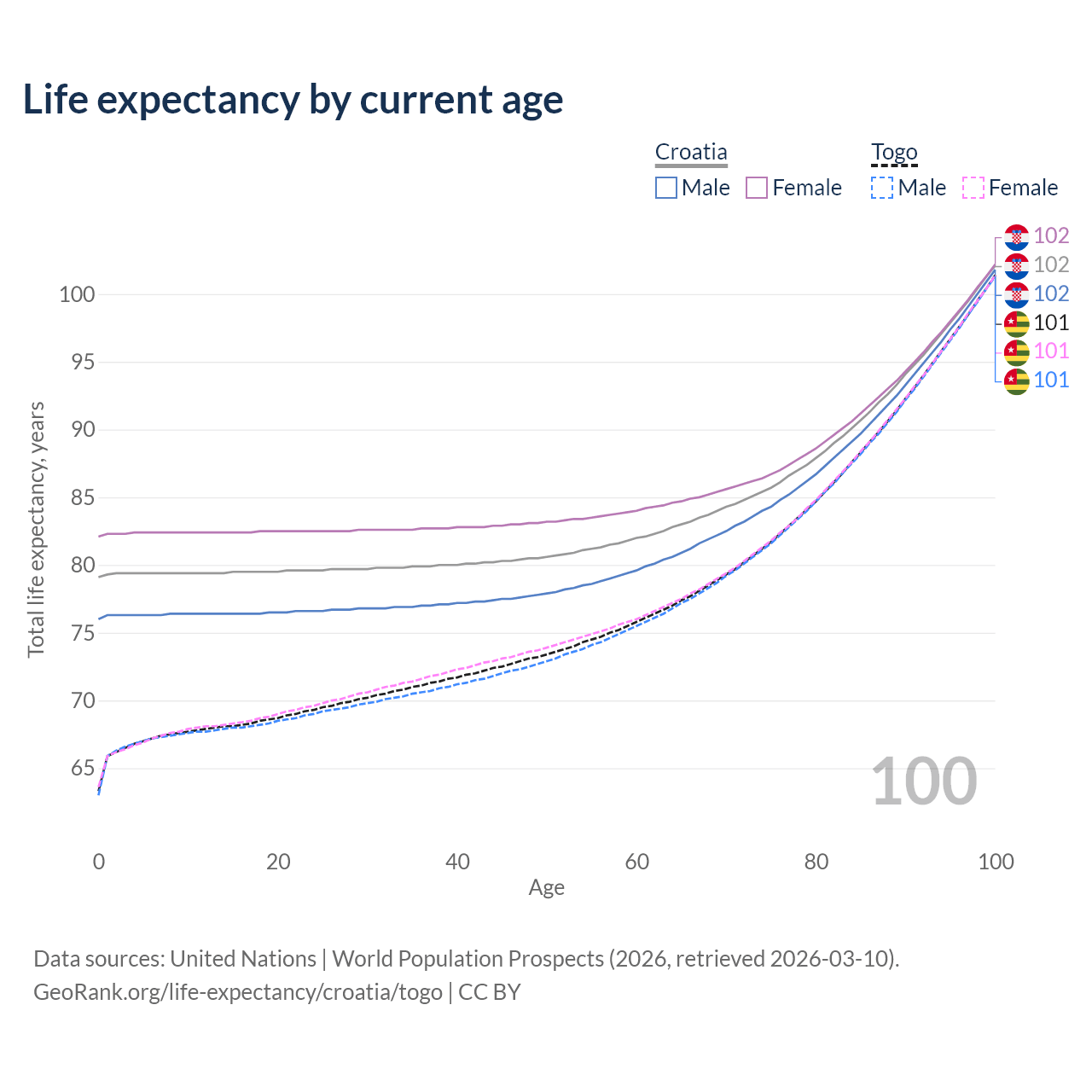 This life expectancy calculator shows the odds of living to 100, 95, 90, and below based on current age for both males and females in Croatia and Togo, along with mean and median age of death. The calculations are based on the 2026 life tables (actuarial tables) from the UN World Population Prospects.