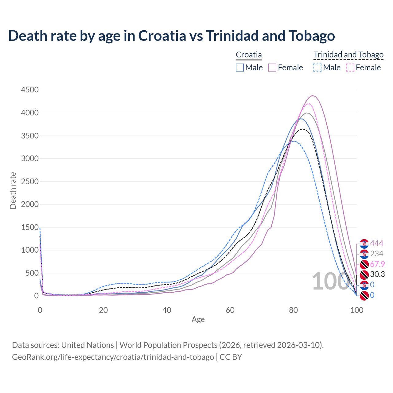 This life expectancy calculator shows the odds of living to 100, 95, 90, and below based on current age for both males and females in Croatia and Trinidad and Tobago, along with mean and median age of death. The calculations are based on the 2026 life tables (actuarial tables) from the UN World Population Prospects.