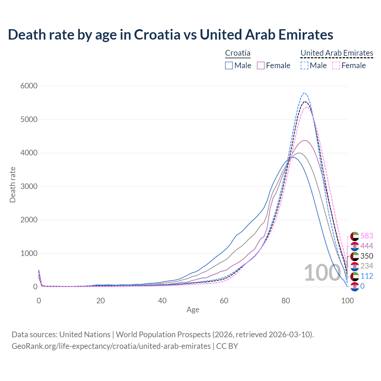 In Croatia, the most common age of death is 84, compared to 86 in the United Arab Emirates. The median age of death is 81.7 in Croatia and 85.6 in the United Arab Emirates, meaning only half of each cohort is expected to live past that age.
