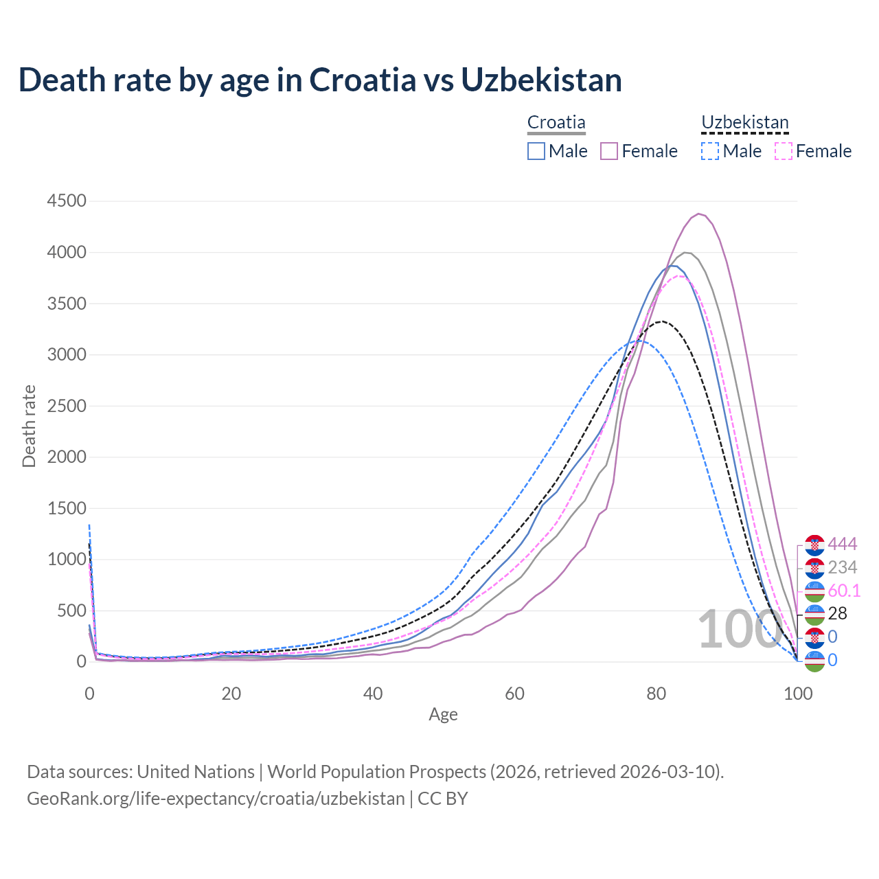 In Croatia, the most common age of death is 84, compared to 81 in Uzbekistan. The median age of death is 81.7 in Croatia and 76.4 in Uzbekistan, meaning only half of each cohort is expected to live past that age.
