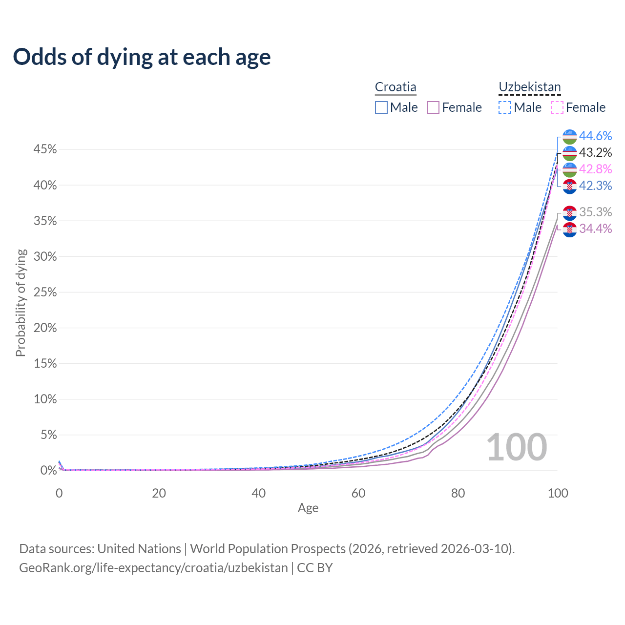This life expectancy calculator shows the odds of living to 100, 95, 90, and below based on current age for both males and females in Croatia and Uzbekistan, along with mean and median age of death. The calculations are based on the 2026 life tables (actuarial tables) from the UN World Population Prospects.