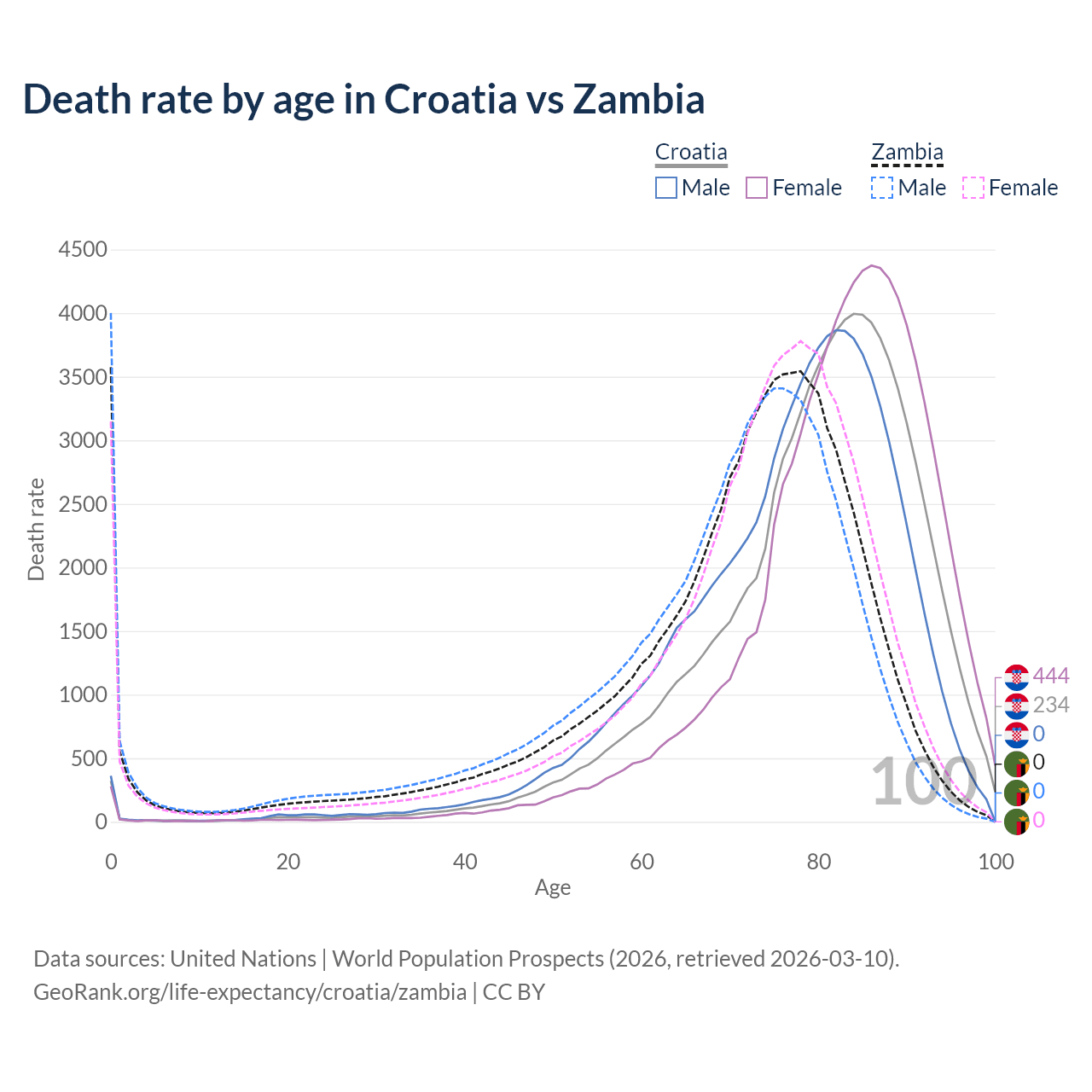 This life expectancy calculator shows the odds of living to 100, 95, 90, and below based on current age for both males and females in Croatia and Zambia, along with mean and median age of death. The calculations are based on the 2026 life tables (actuarial tables) from the UN World Population Prospects.
