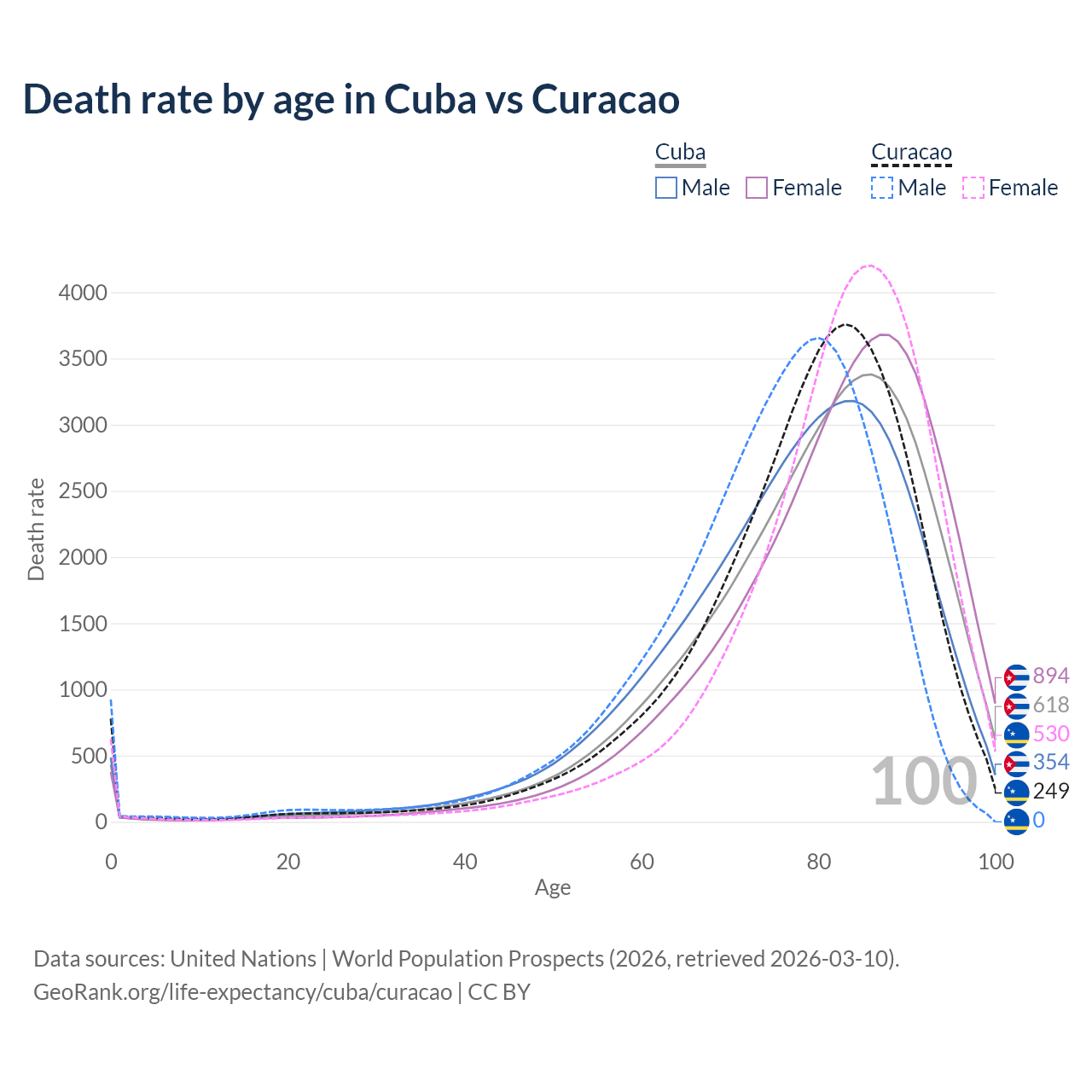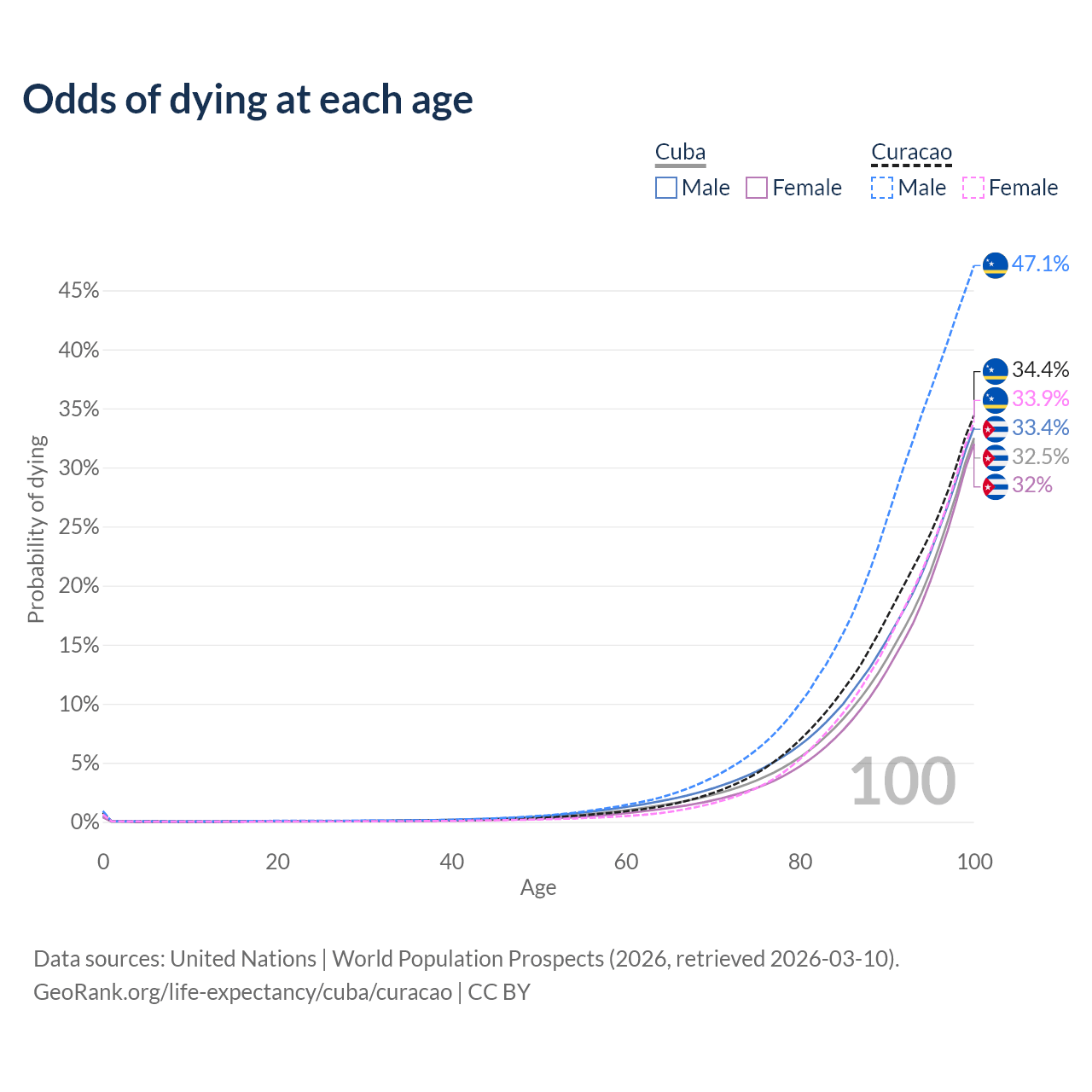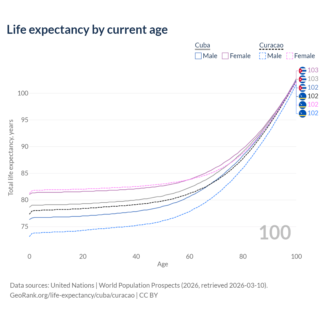 This life expectancy calculator shows the odds of living to 100, 95, 90, and below based on current age for both males and females in Cuba and Curacao, along with mean and median age of death. The calculations are based on the 2026 life tables (actuarial tables) from the UN World Population Prospects.