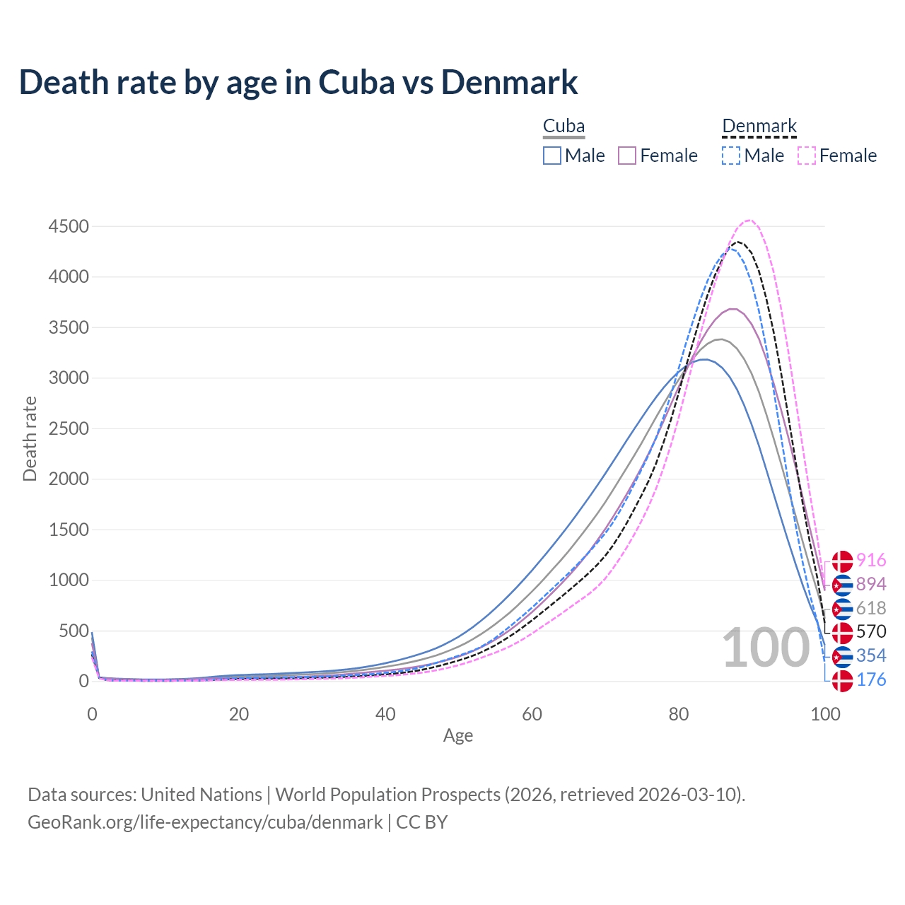 This life expectancy calculator shows the odds of living to 100, 95, 90, and below based on current age for both males and females in Cuba and Denmark, along with mean and median age of death. The calculations are based on the 2026 life tables (actuarial tables) from the UN World Population Prospects.